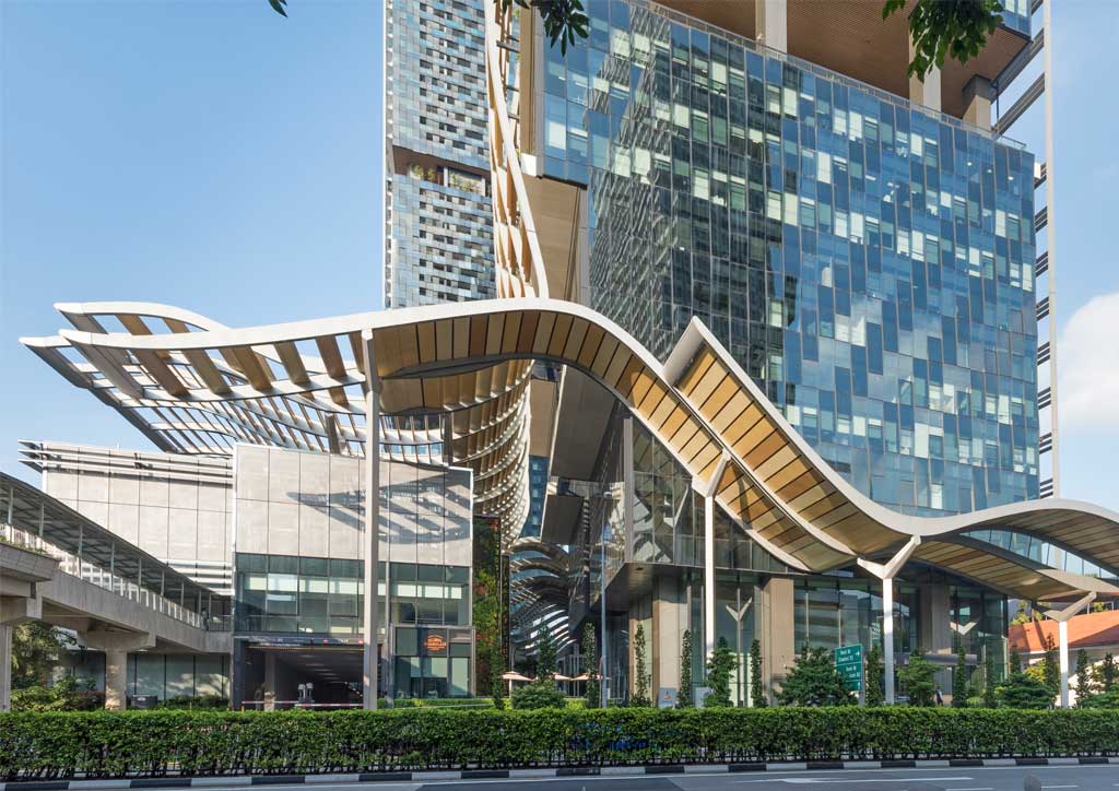 The two skyscrapers, situated at the north and south of the lot, carry undulating forms that seemed to be carved out by the wind. They are periodically broken up by 10-meter high sky gardens and, in the case of the hotel and residential tower, manages to incorporate a multi-level air well that makes cross-ventilation an option for future residents. The east and west facades of the towers, bearing the brunt of the harsh, tropical sun, are sheathed in an expansive louver system acting as brise soleil, which appear to grow out of the expansive roof canopy that shields 57% of the public spaces below.