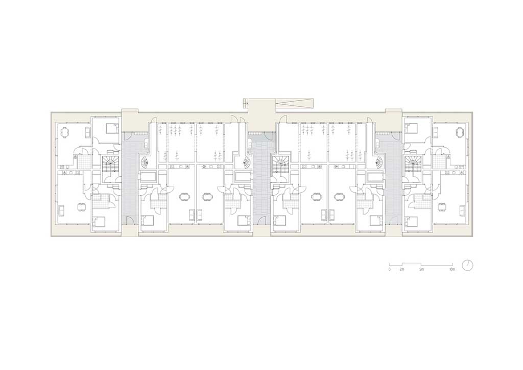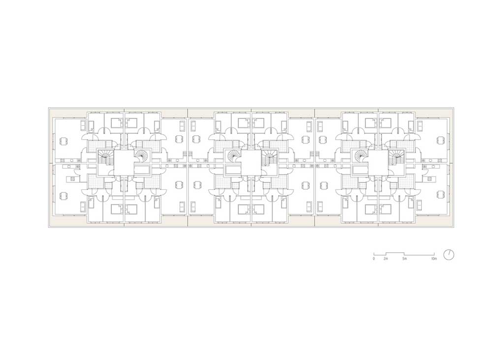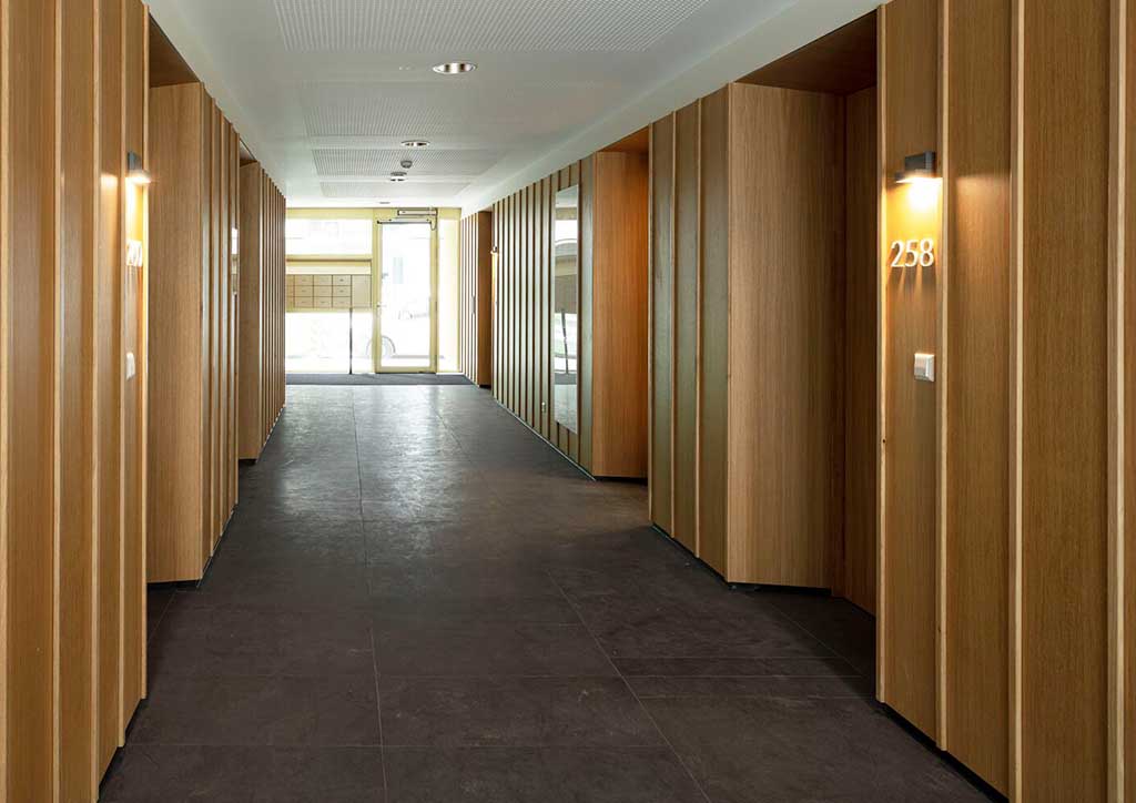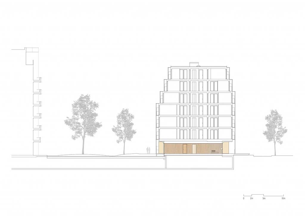 On the ground floor are three main lobbies where the upper floors can be accessed, one on the center and two are beside the end units. These entrance halls are finished with high grade oak paneling and dark colored floor tiles which is contrasted with white perforated ceiling giving the residents a warm cozy feeling echoing that of the hotels. The upper floors, the last 3 floors, are slightly reduced to ensure maximum daylight at street remains possible. An underground car park is available for the residents, and this also supports the shared courtyard garden where residents can also hang out from time to time.