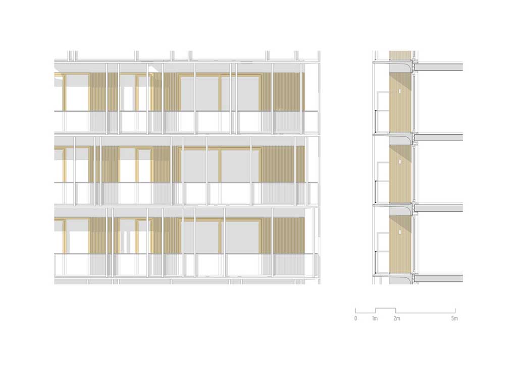 Behind this veil-like skin is another layer of skin that is wrapped around the exterior walls of the apartment building. These are the articulated vertical aluminum profiles that are anodized with a light shade of gold. What’s amazing about this vibrant color is the dynamic appearance created from the different tones and shadows displayed as the sun shines through the building.