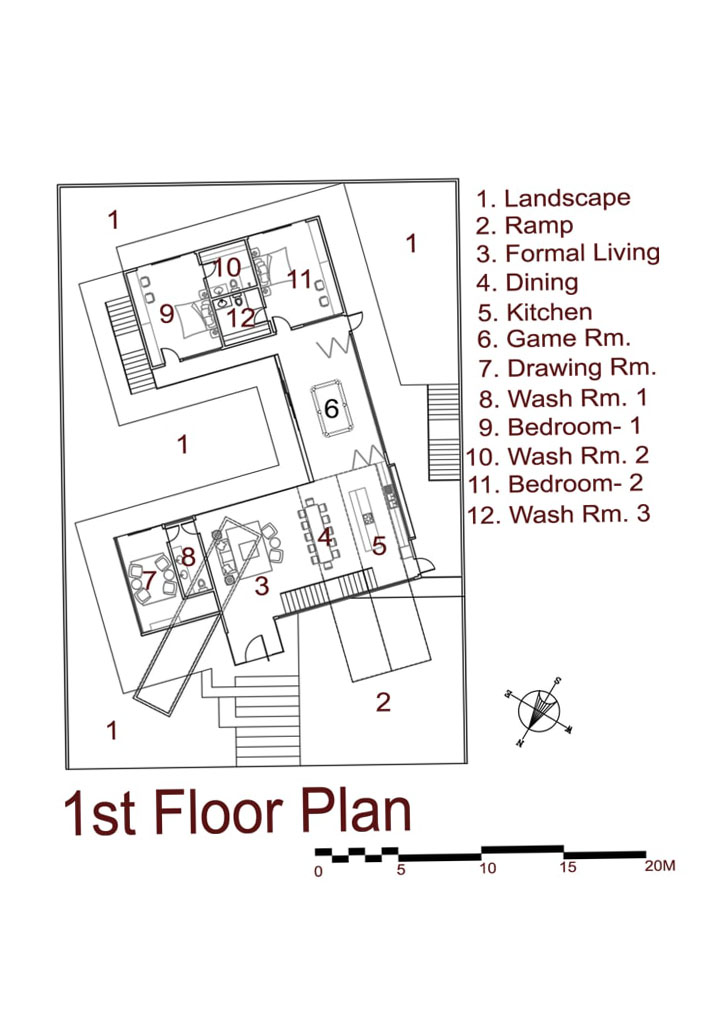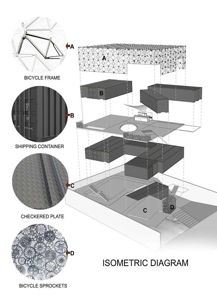 Wind direction is also taken into account due to the Philippines being a frequent typhoon belt. The house is oriented along the North-East side and South-West side. A Central courtyard will provide an excellent passive cooling effect all year round, with the North-East wind blowing during November all the way through May and the South-West wind blowing from June through to October. As some parts of the house are facing West, scrap bicycle frames will be welded together to act as cage-like structures to serve as an interesting brise-soleil that can provide shade for parts of the house against the hot afternoon sun. This ingenious use of the bicycle frame creates a “sculptural crown structure” and is the highlight of the whole composition.