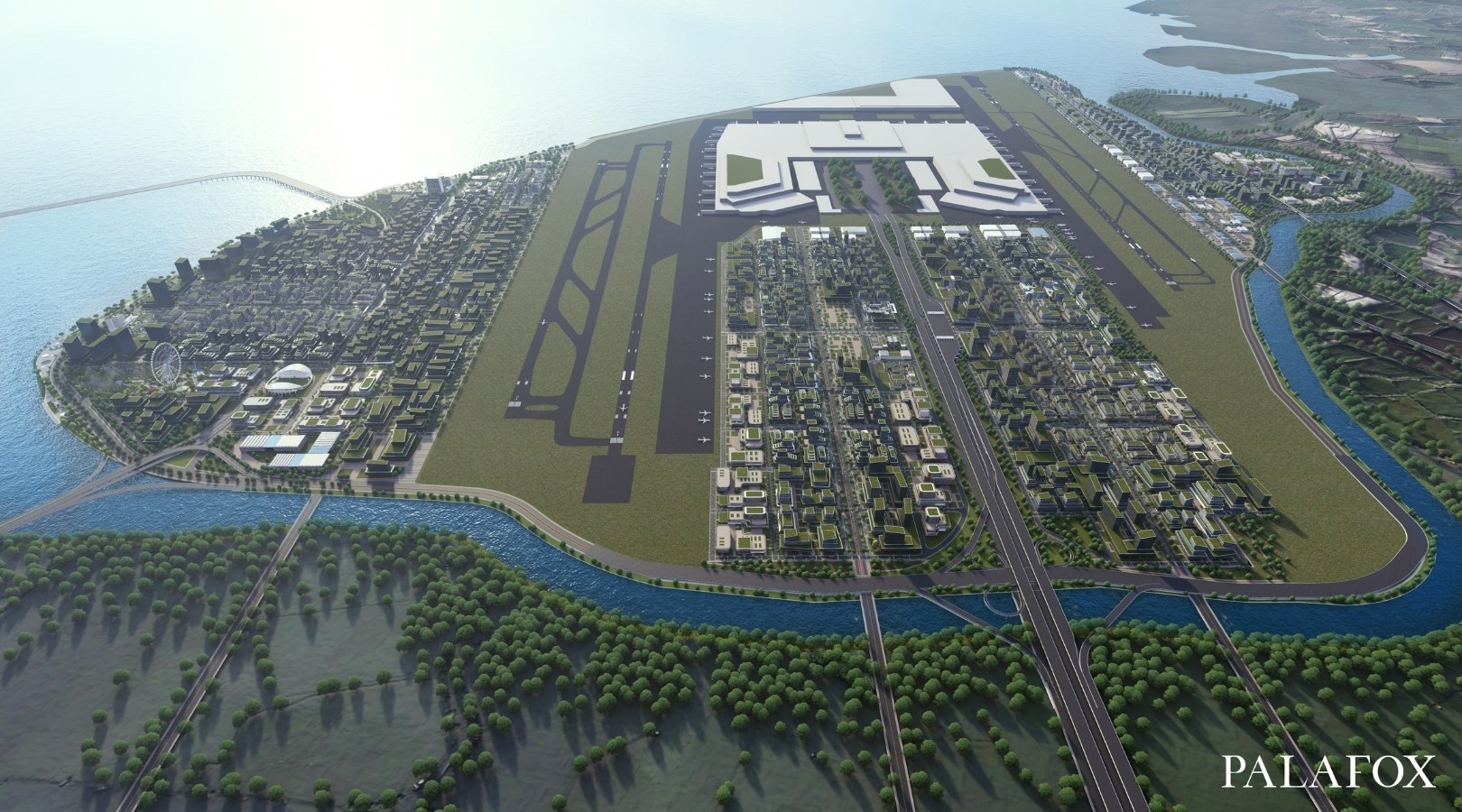 “Bulacan Aerotropolis is a proposed airport-driven city in the province of Bulacan highlighting accessibility, connectivity, and mobility. It will feature wide boulevards filled with landscaping, greenery, and dedicated lanes for mass transportation, biking, active frontages, and pedestrian walkways. It will also feature buildings interconnected by skywalks, and ideally would generate more access and connectivity between buildings and increase floor area for safe and comfortable urban-designed public spaces. These skywalks can also potentially become micro-solar farms, using renewable energy to power street lights and other urban design fixtures that contribute to pedestrian comfort and safety. Among other concepts around green architecture and green urbanism, the plan also introduces waterfront development as a way to protect the site from storm surge but at the same time functions as an environmental sanctuary and a submersible green space, and increase more frontages that utilize the coastline. It would also help in the plan that greenspaces are always within 15 min. walking distance at any point in the city.”