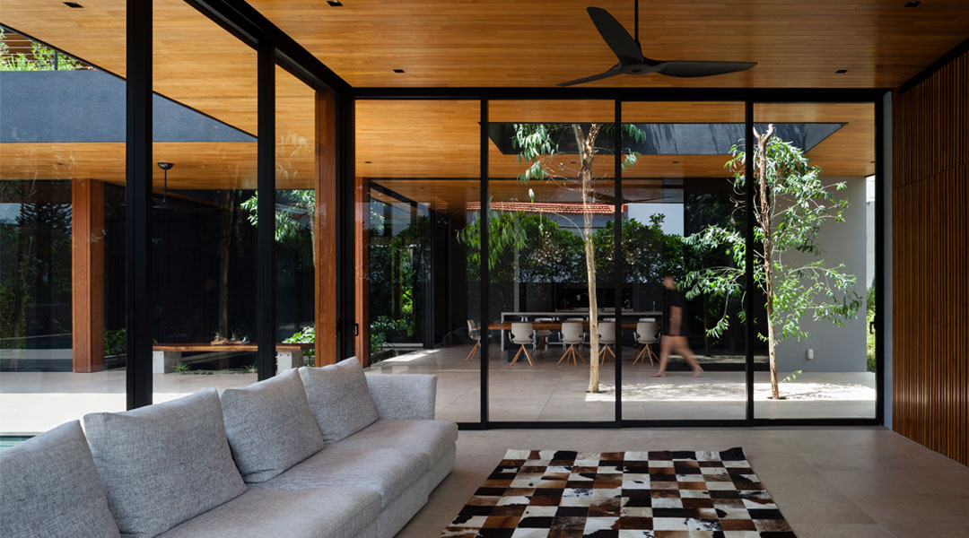 The entrance to the house is at the very back of the lot, making the most of the processional experience from the city garden and pool, and into the welcoming pavilions of this young family of five. From the discreet carport (no views of parked cars from any part of the home’s interiors), one walks down a sheltered passageway lined with river stones to a 3.53-meter-tall door. The processional act does not end there. The door opens to a vestibule, from which one can see all the key spaces of the ground floor, each in their pavilion, connected by canopies 4.8 meters deep and underlaid by soffits and ceilings of rich, warm wood.