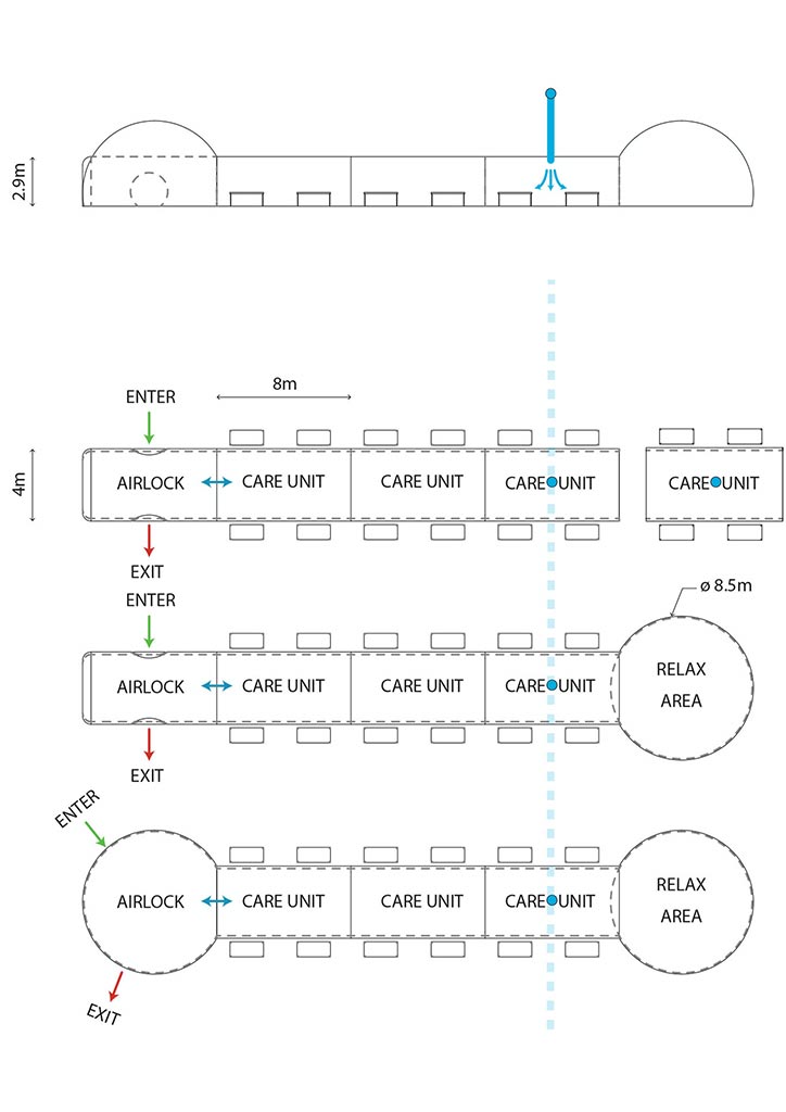 On a wider scale, the Mobile PPS has three areas. the air lock space where doctors undergo the usual disinfection procedure, the extension of care units where doctors treat patients (this space has the medical machines inside the bubble and attached arm gloves on the surface), and the relax area where doctors can rest.