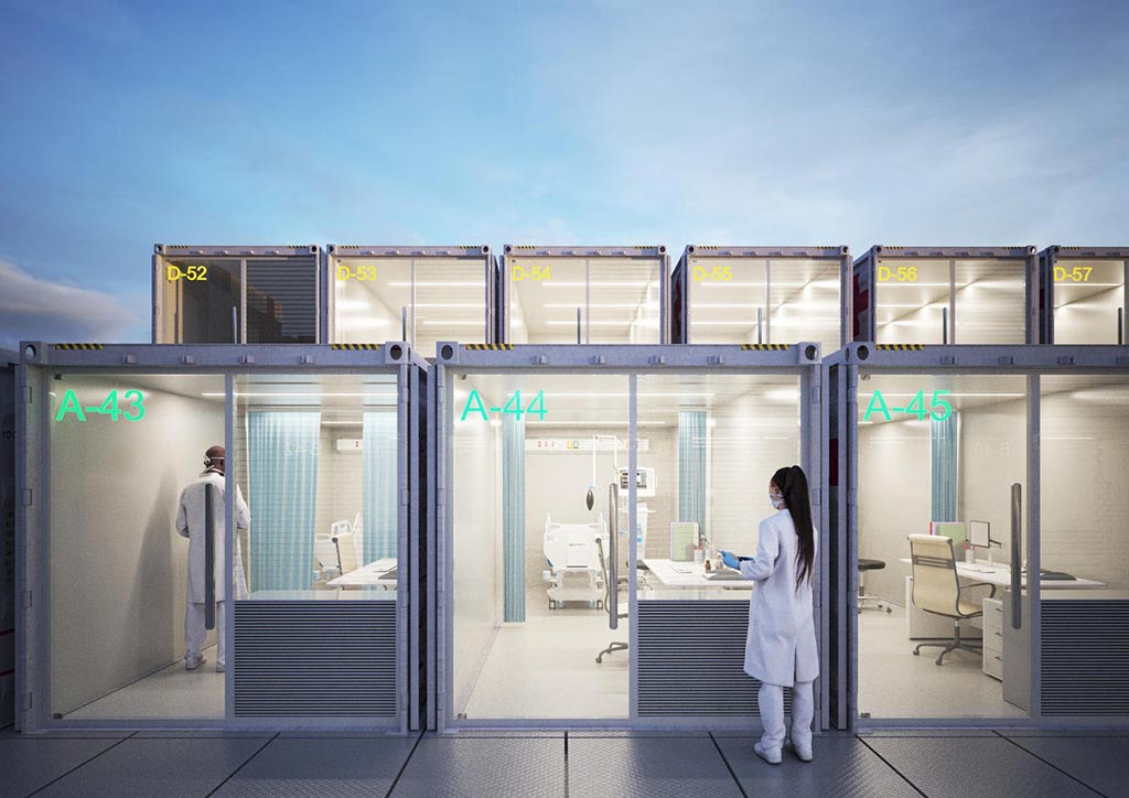 Weston Williamson + Partners also made a suggestion of hospital ships where each vessel would have 3,500 container modules. A simple alternative to the usual hospital beds, patients would only stay on the ship in case there are no other areas available to deploy the containers. These containers were adapted by removing one of the steel doors and replacing it with perspex panels. These panels also allow for natural ventilation and a built-in air-conditioning unit.