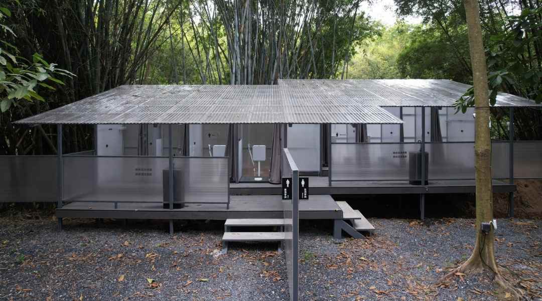 The female bathroom has a plane area of 4.8 x 1.2 meters, placed between the two groves of bamboo on the soil slope. The elevation is marked at 1.2 meters. Meanwhile, the plane unit of the male bathroom platform staggers with it, simultaneously lowering the height of one step. In addition, the platform of the male bathroom is extended to the right for the purpose of forming a passage leading to the female bathroom. By analogy, the front side of the male bathroom will be lowered to one platform, forming the passage into it.