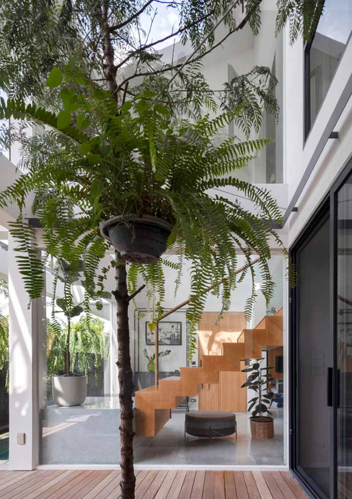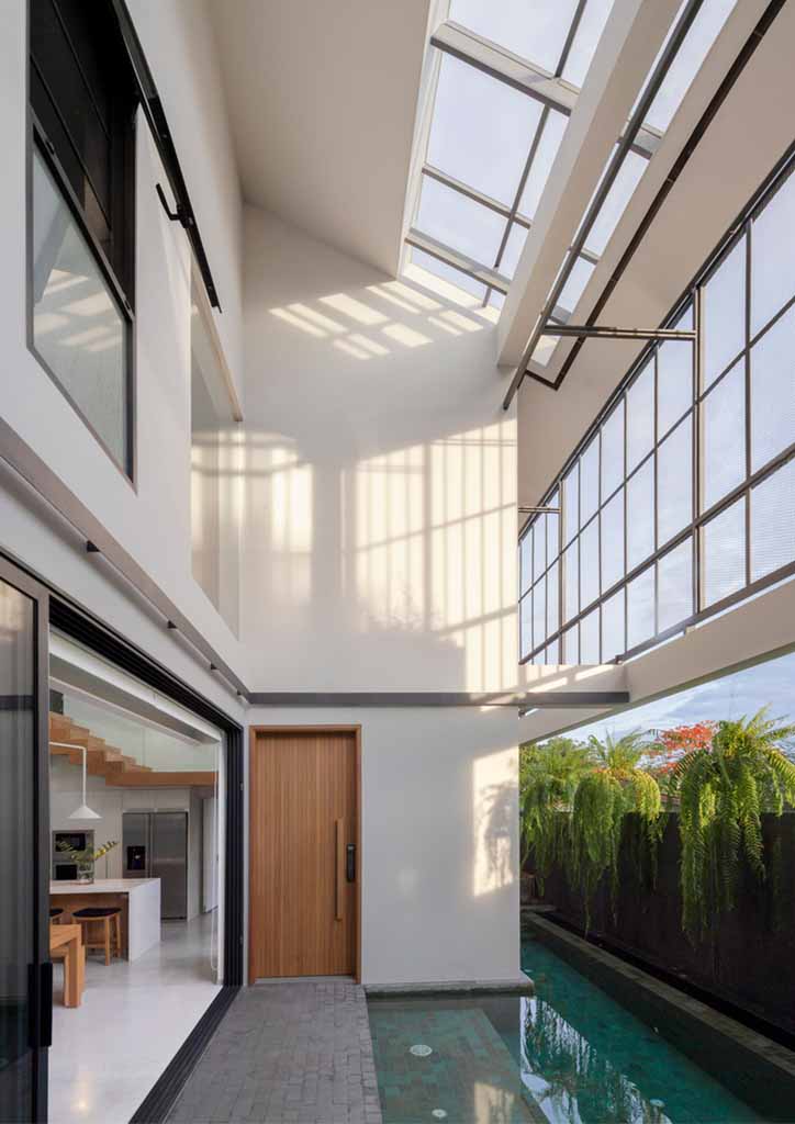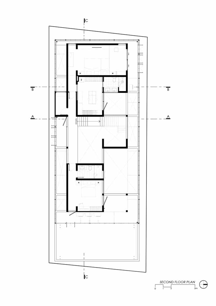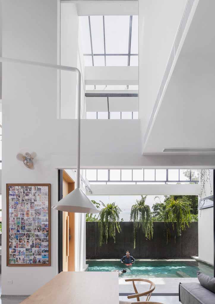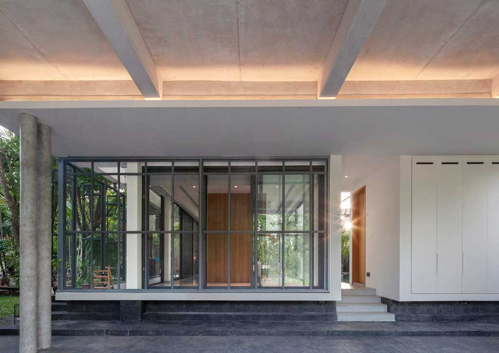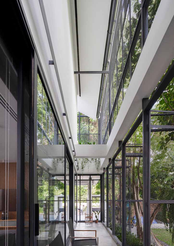 The ground floor houses all the communal areas which also have direct access to the other features of the house, the modest size shallow pool terrace, and the pocket tree garden. It also enjoys the open ceiling concept to maintain visual contact with residents on the upper floor. On the second floor are all the private spaces, such as the 3 bedrooms, all surrounded by terraces enclosed by that second skin of steel mesh.