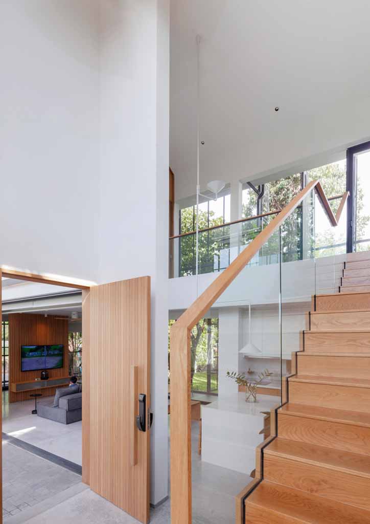 Entering the main house, guests and residents are welcomed by the open layout of the living spaces. The clean white interiors, the muted furnishings, and the timber accents such as the stairs, the handrails, and some parts of the flooring, make the whole area look more spacious and exudes that calm and peaceful ambiance of the house.
