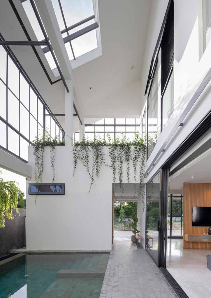 From the street, the façade of the Wehha House displays simple, white-painted walls with a monotonous plant box, which helps highlight the greens even more. Also noticeable are the steel framing in gray color on both floors of the house. These framings hold the almost transparent steel mesh, which is wrapped around the whole house serving as the permeable façade of the house and can also be called the second skin. With its transparent qualities, optimum natural light and ventilation are enjoyed by the residents, and also, their privacy is still not compromised because of the ample setback considered in positioning the main walls. These setback spaces somehow fulfilled the architect’s vision of having seamless transition spaces, sandwiched by the main walls and the mesh wrap.