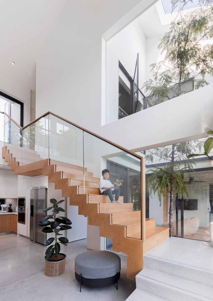 “With a passion for aviation of the owners, they required a house with a connection to nature. Hence, the concept of the house was created to reflect their characteristic,” shares design team. With this design brief, the architect’s direction was to create spaces that exhibit susceptibility to the environment, allowing maximum entry of natural light and ventilation, such as having a seamless transition of spaces between the indoors and the outdoors. Another consideration to look at to is the role of good material selection.
