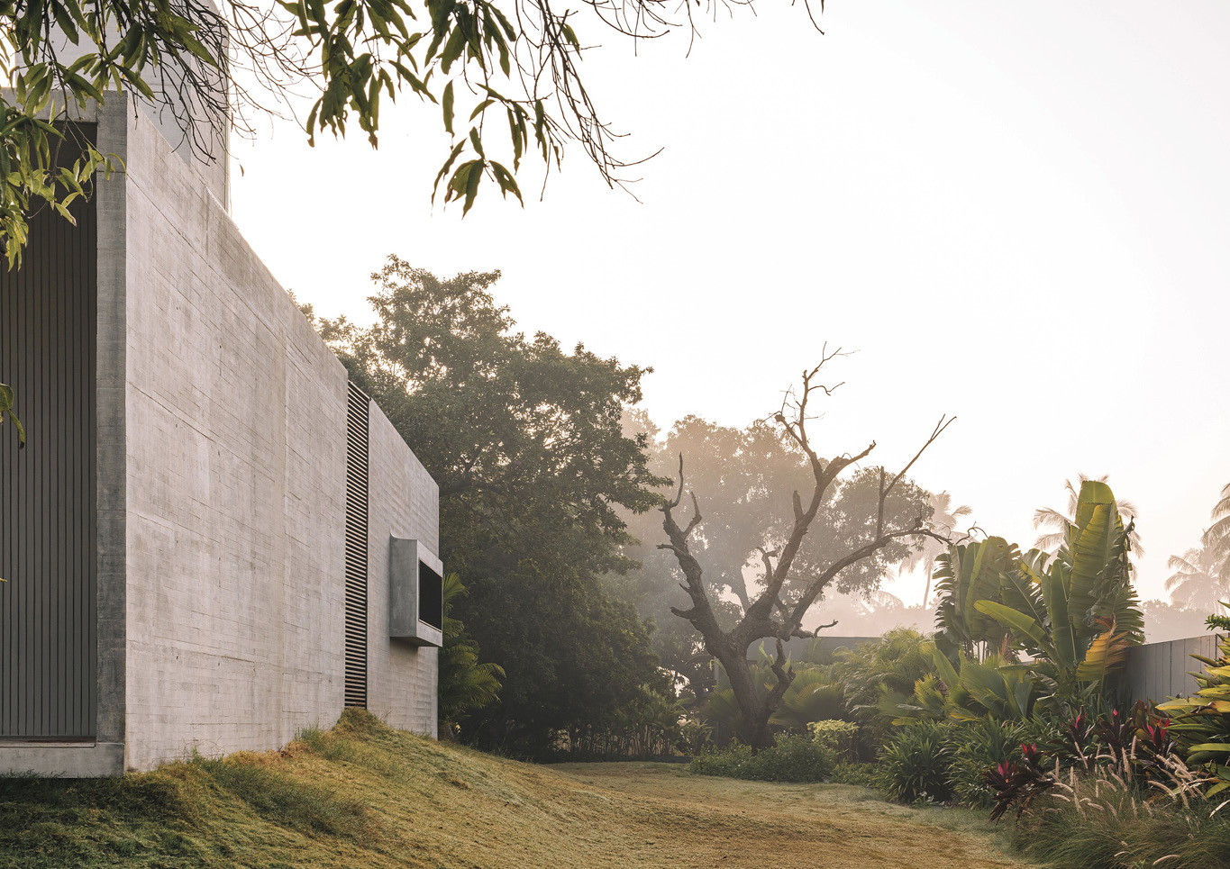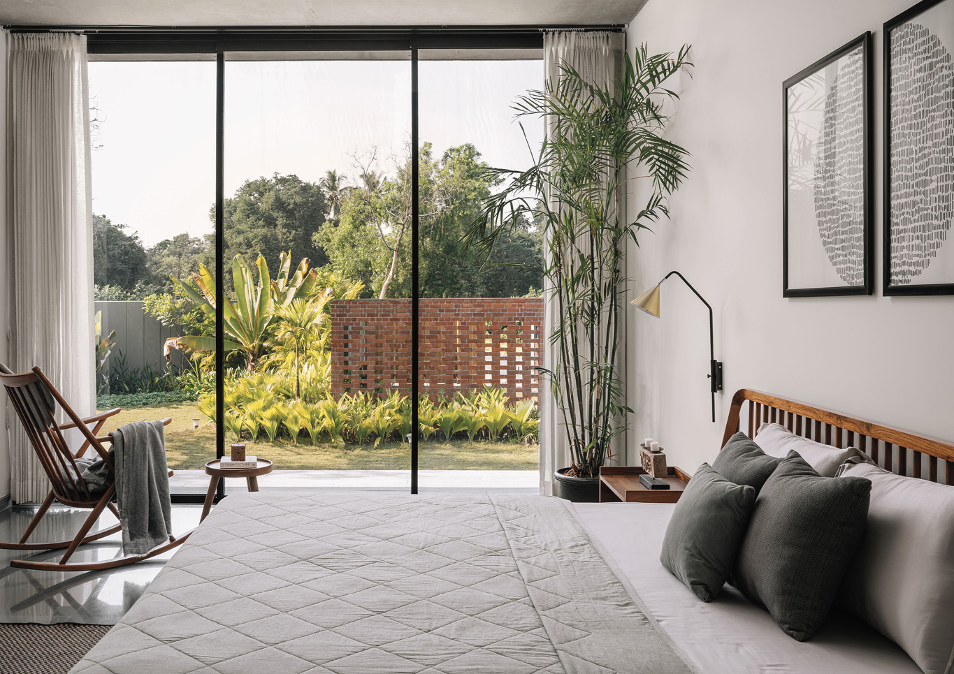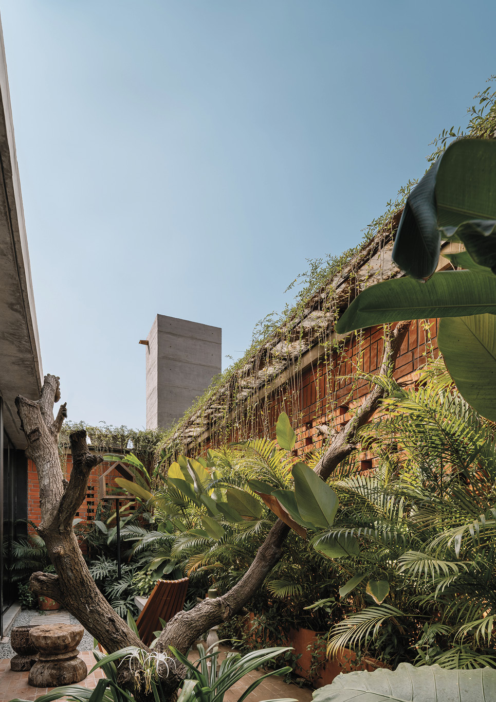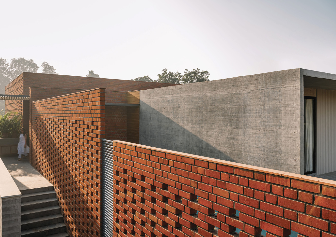 The house is also designed as a sustainable and self-sufficient entity, harnessing energy from solar panels recessed and hidden on the roof, while the implementation of percolation wells on the edges helps in preserving the groundwater level. The rainwater is harvested and utilized for the house’s multiple water demands. The home is built around the notion of coexisting with nature, allowing for smooth transitions and giving its occupants a tranquil retreat where they may unwind and connect with the outside world. The house weaves the built mass that embarks on Indian traditional elements and arts, creating balance and visual harmony. The spaces with this meditative nature are woven through an intricate fabric of green layers and materiality inside out, defining the house truly as an earth’s child.