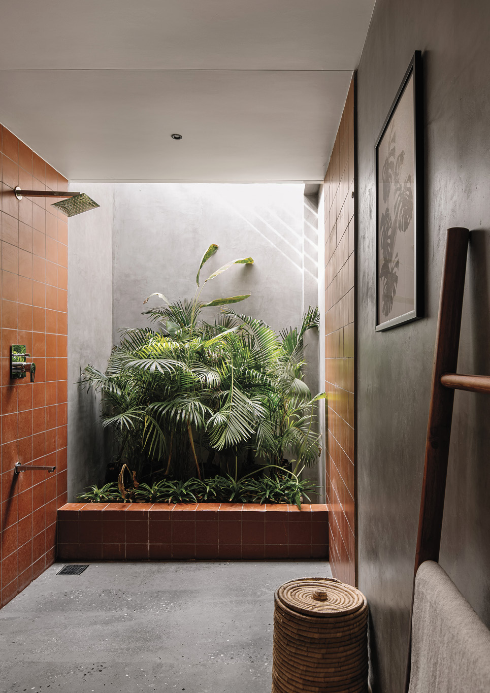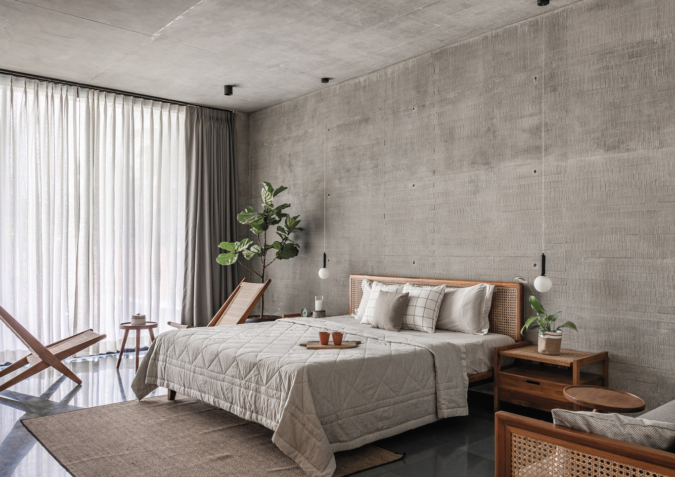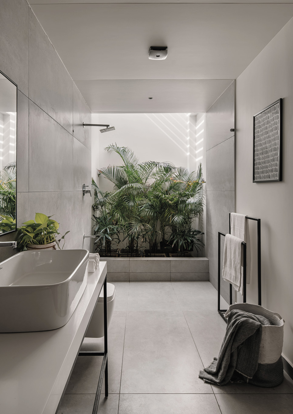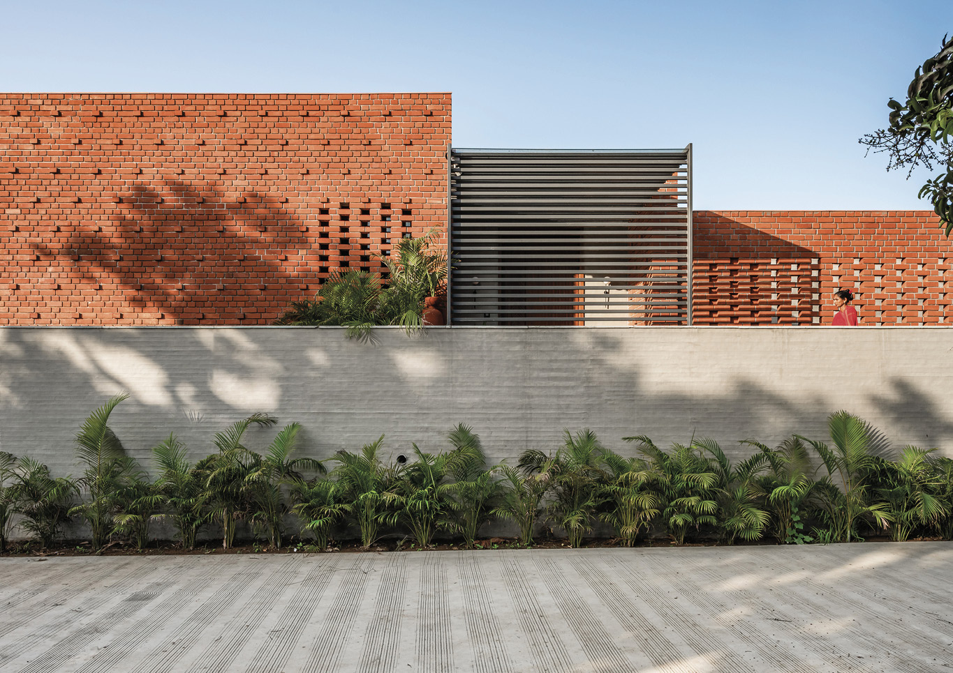 The house is also designed as a sustainable and self-sufficient entity, harnessing energy from solar panels recessed and hidden on the roof, while the implementation of percolation wells on the edges helps in preserving the groundwater level. The rainwater is harvested and utilized for the house’s multiple water demands. The home is built around the notion of coexisting with nature, allowing for smooth transitions and giving its occupants a tranquil retreat where they may unwind and connect with the outside world. The house weaves the built mass that embarks on Indian traditional elements and arts, creating balance and visual harmony. The spaces with this meditative nature are woven through an intricate fabric of green layers and materiality inside out, defining the house truly as an earth’s child.