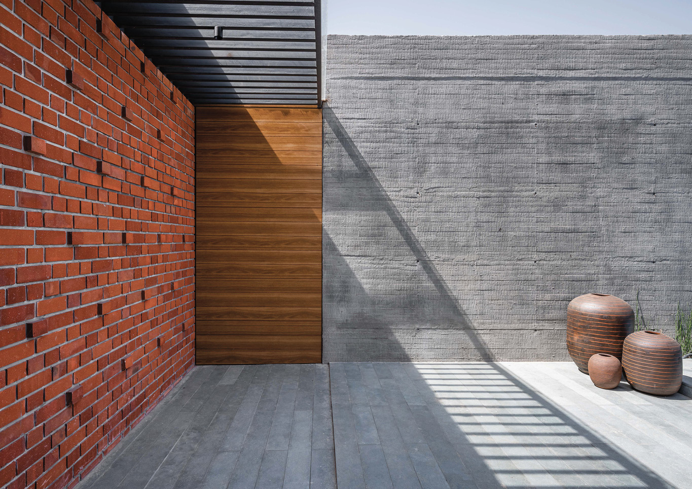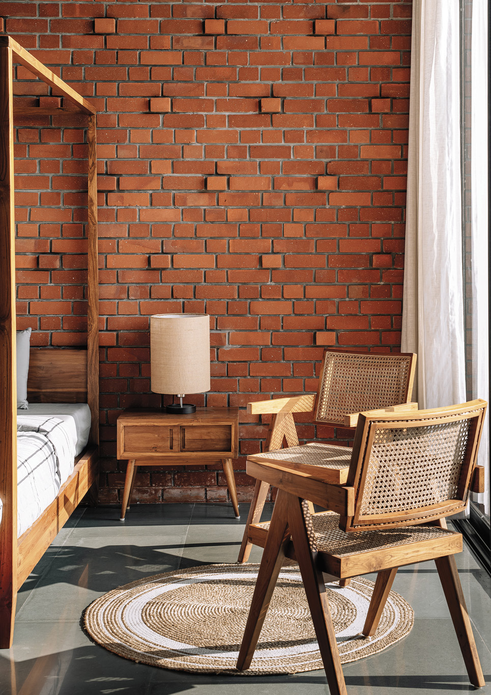To highlight the craftsmanship and remove extraneous layers of cosmetics, each space is thoughtfully designed with minimal and flexible wooden furnishings, set against the raw and natural aesthetics of walls. True to the concept, small courts are introduced in the bathrooms to admit diffused daylight and preserve the indoor-outdoor connection. Exposed brick walls feature distinctive embossed brick and diamond patterns inspired by Ikat print patterns; the concrete walls exhibit a subtle interweaving of threads akin to those found in fabrics. The flooring is primarily composed of Kota stone, differentiated through the use of patterns and different finishes.
