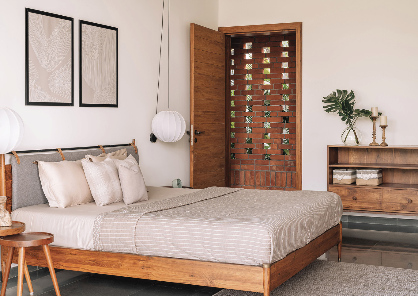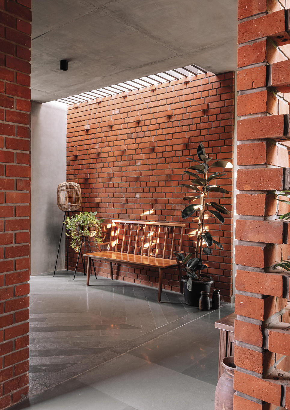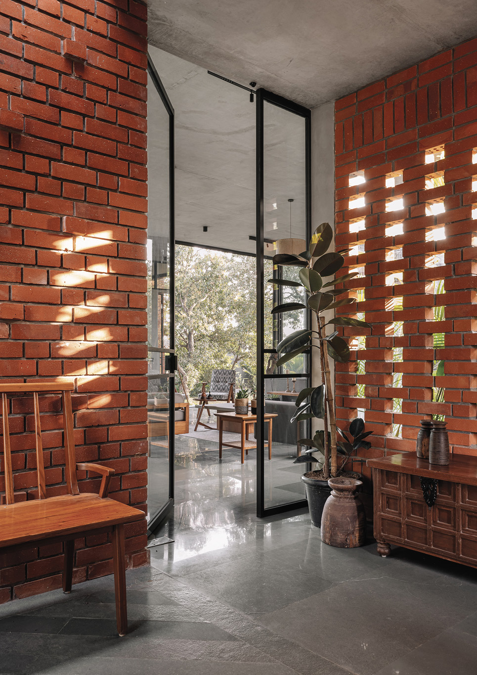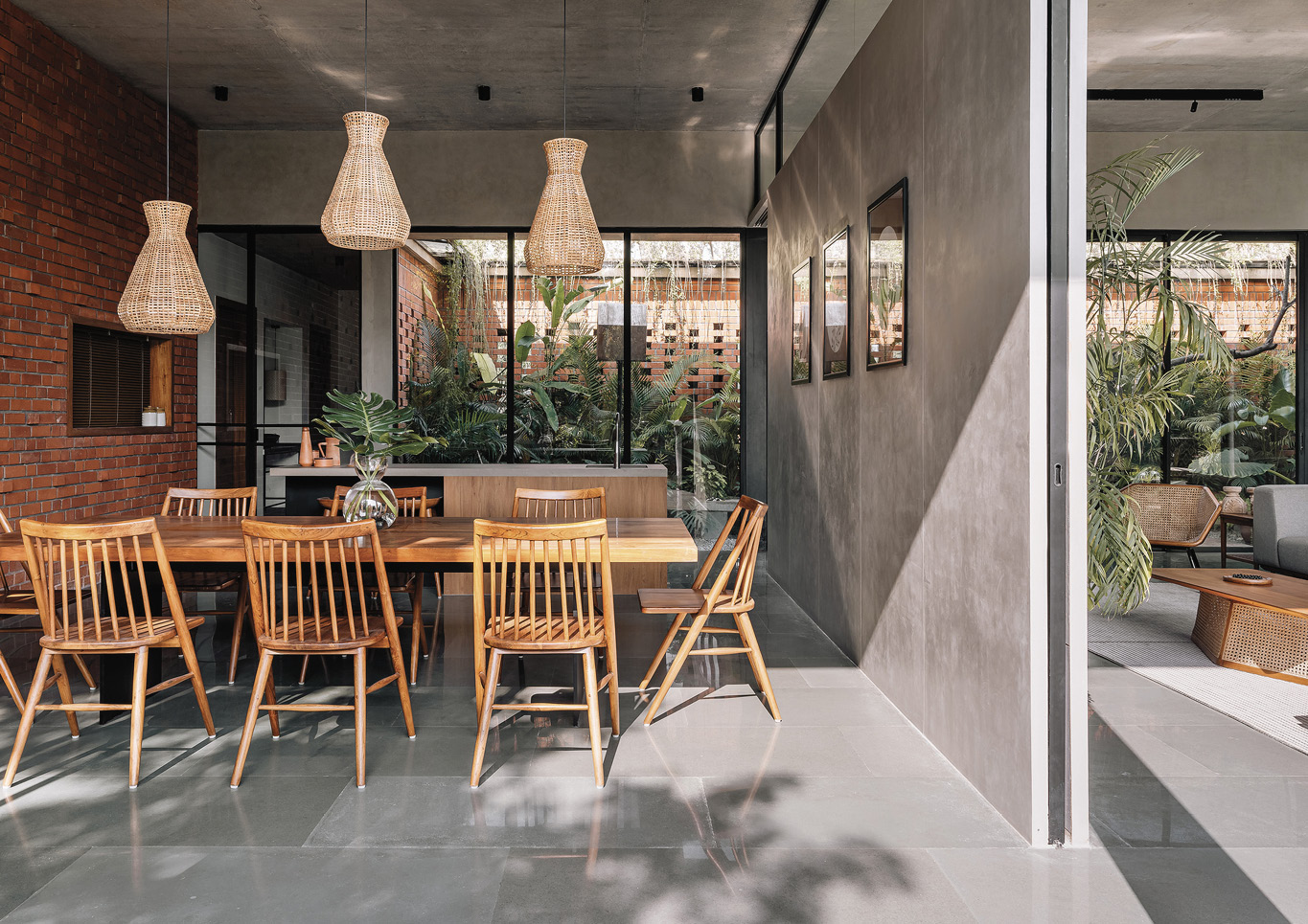 At the entrance, a cascading perforated brick wall provides privacy for the house and swimming pool while serving as an elegant backdrop for the surrounding flora, accentuating them as the design’s protagonist. The entrance to the house is through an enclosed hallway ascending to the foyer leading to the main door, the house unfolds into a single, spacious area. Ample openings and courts allow for natural light and ventilation, which continually alter the space’s dynamics throughout the day, feeding into the sense of liveliness. The functional zones of the house, including the family area, living room, dining room, and bedrooms, are all seamlessly connected to gardens, courtyards, and decks, fostering a harmonious connection between the indoor and outdoor spaces.