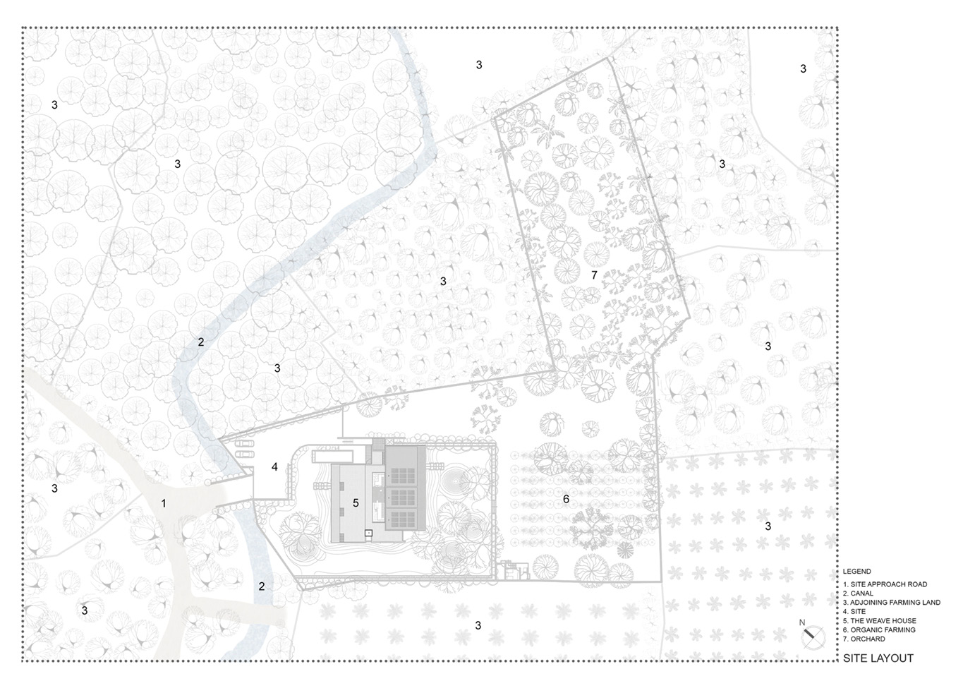 The architect explains that the concept evolved to seamlessly create a harmonious interweaving of the built environment and landscape. The spatial planning inspired by a traditional house is modernized with design elements and materials to constitute a contemporary home woven into a rural settlement. The architects sought to incorporate the client’s lifestyle into the design and drew inspiration from his profession of textile weaving to inform the design of the space, integrating elements that are reflective of the craft throughout the house.