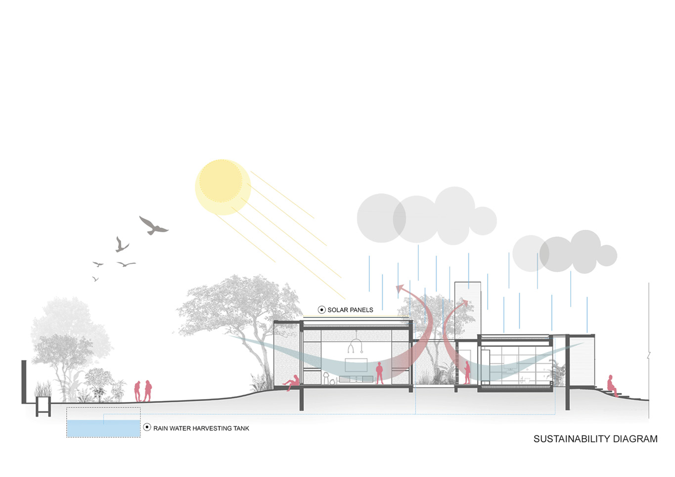 The distinctive boomerang-shaped farming site steered the design of the house that was proposed in the sparsely planted region at the front, hence retaining an extensive span of dense orchards at the back.