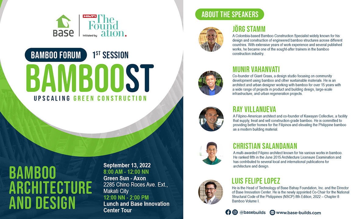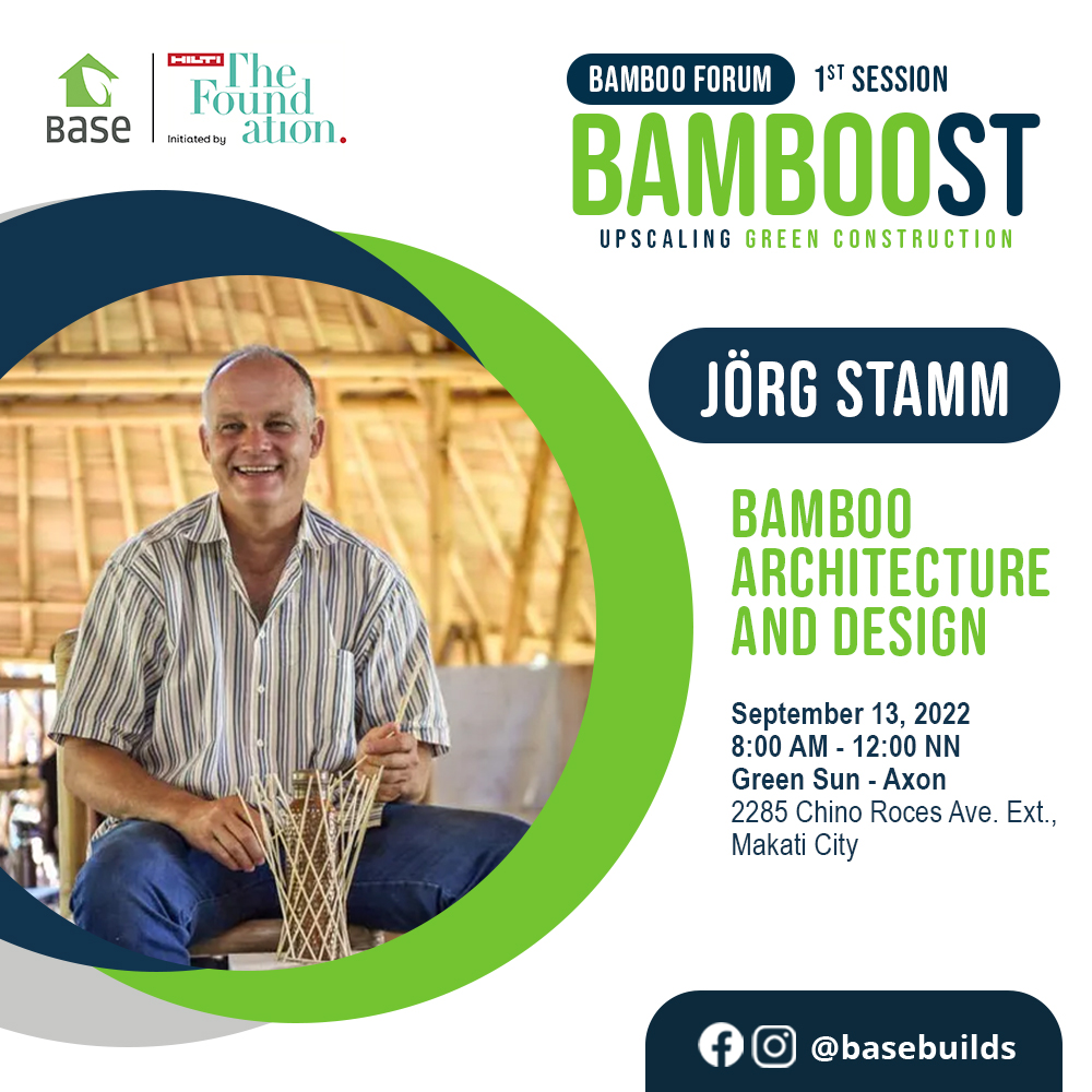 On September 13, Base Bahay Foundation will boost the local industry through its first onsite talk: Bamboost featuring globally respected Bamboo Construction specialist, Jorg Stamm as part of their learning series that advocates the use of bamboo as sustainable building material.