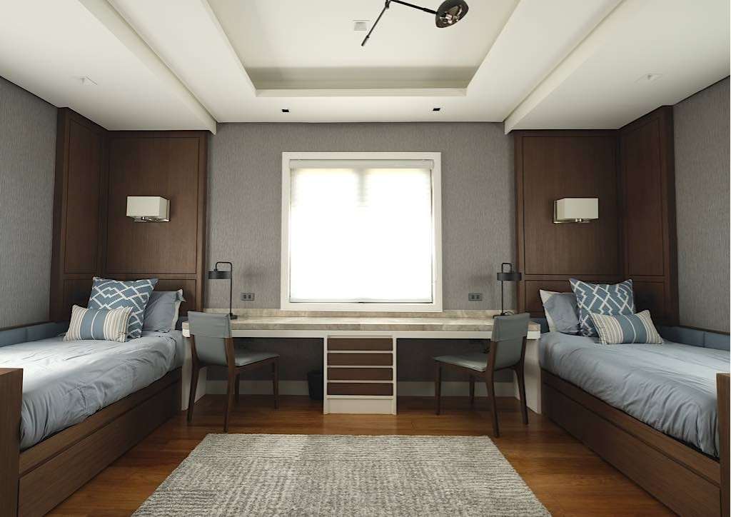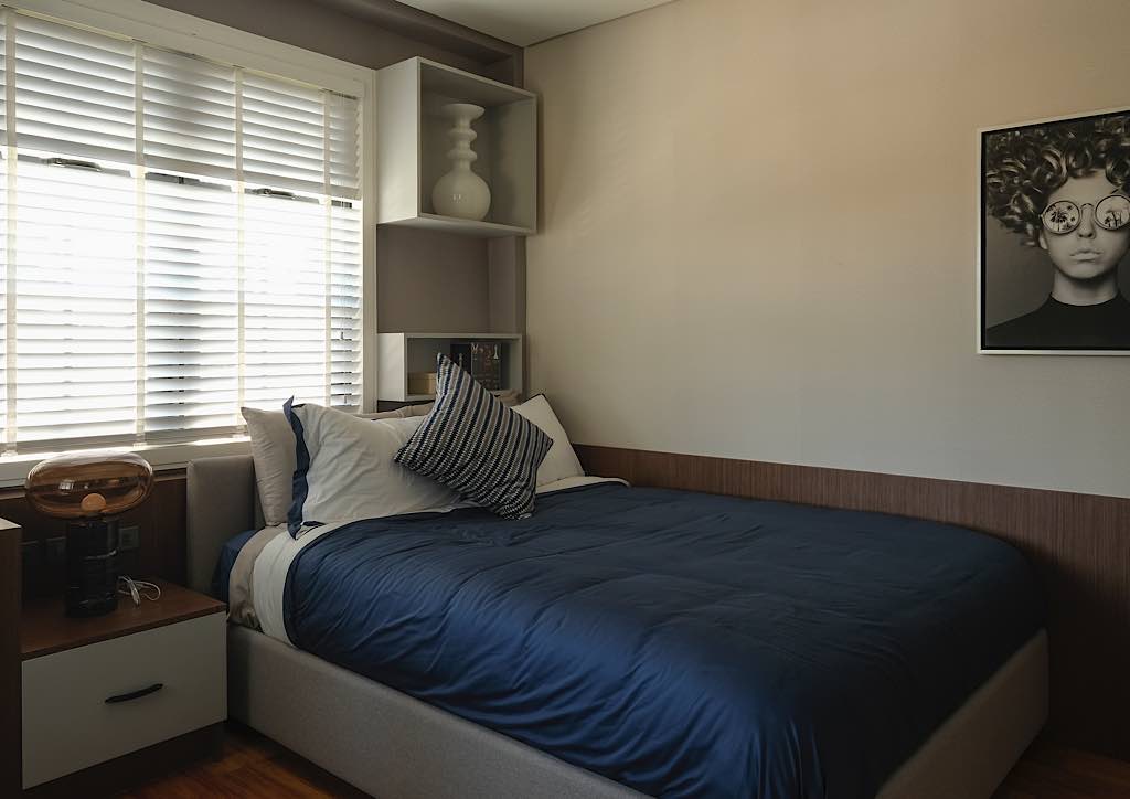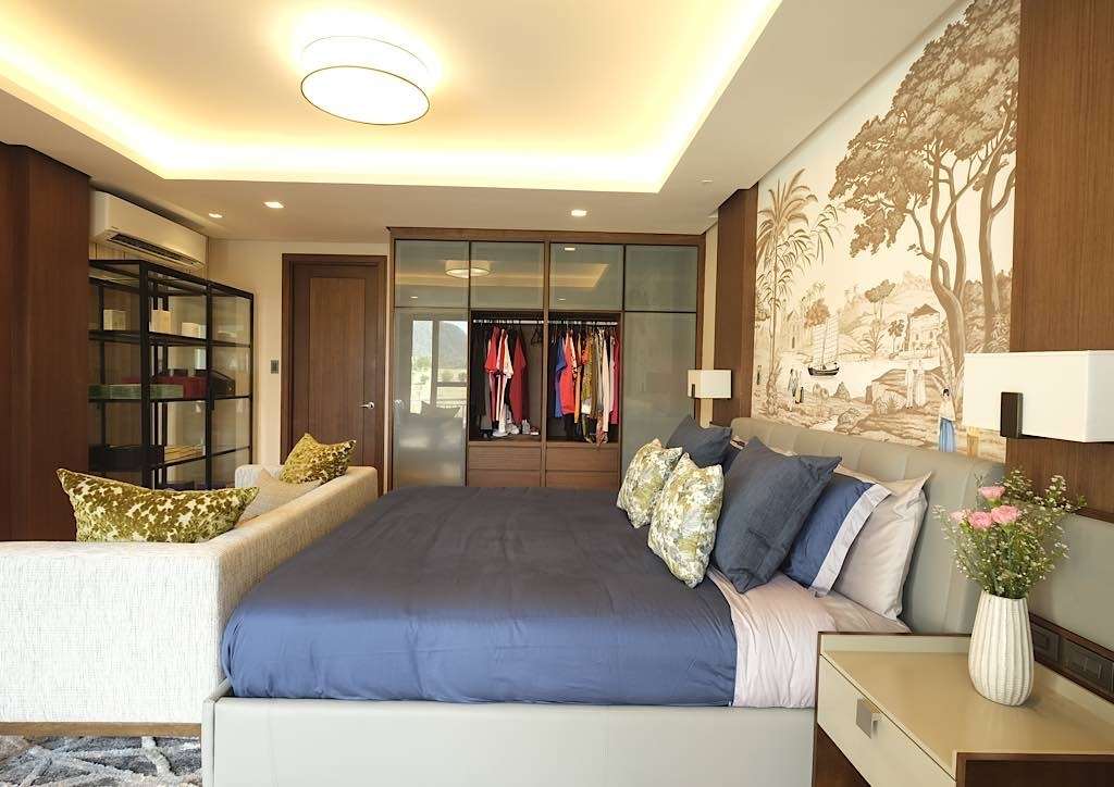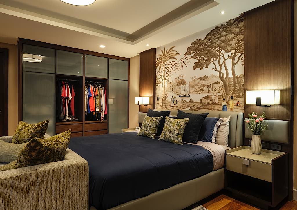 The master bedroom is a masterpiece in itself. A hand-painted mural is over the bed that blends into the cool tones of the room. A big picture window opens up to the view of the hills and is a great sightseeing spot for the sunrise or the sunset. There is hardly a need to use the air-conditioner due to natural breeze coming in from the window.