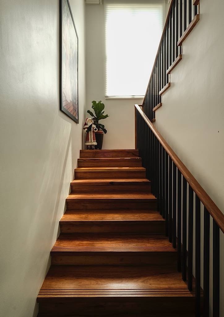 Returning downstairs, there is a hallway leading to the kitchen, where a collection of artwork is beautifully placed against a brown wall. A nice blend of colors and hues, there is a mix of works from known artists and the owners’ son from when he was a child, framed and preserved, to give an even more personalized touch into the home.