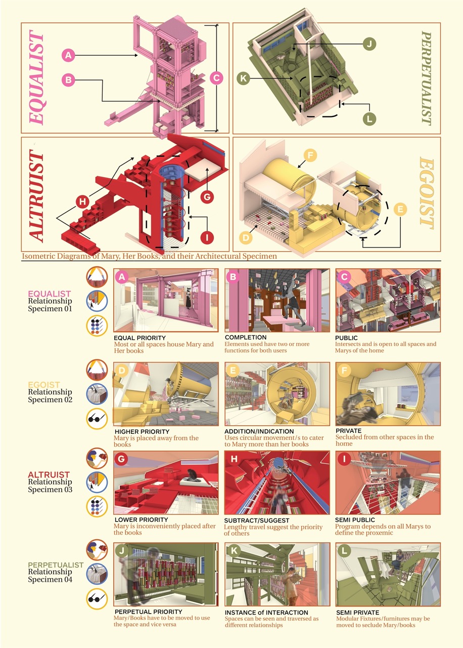 The main premise is in how Mary makes use of her spaces. It relates to the ecological aspect of architecture as a means of action based on the user’s prerogative. A pairing of contrasting behaviors labels the attitudes and gestures towards their spaces.