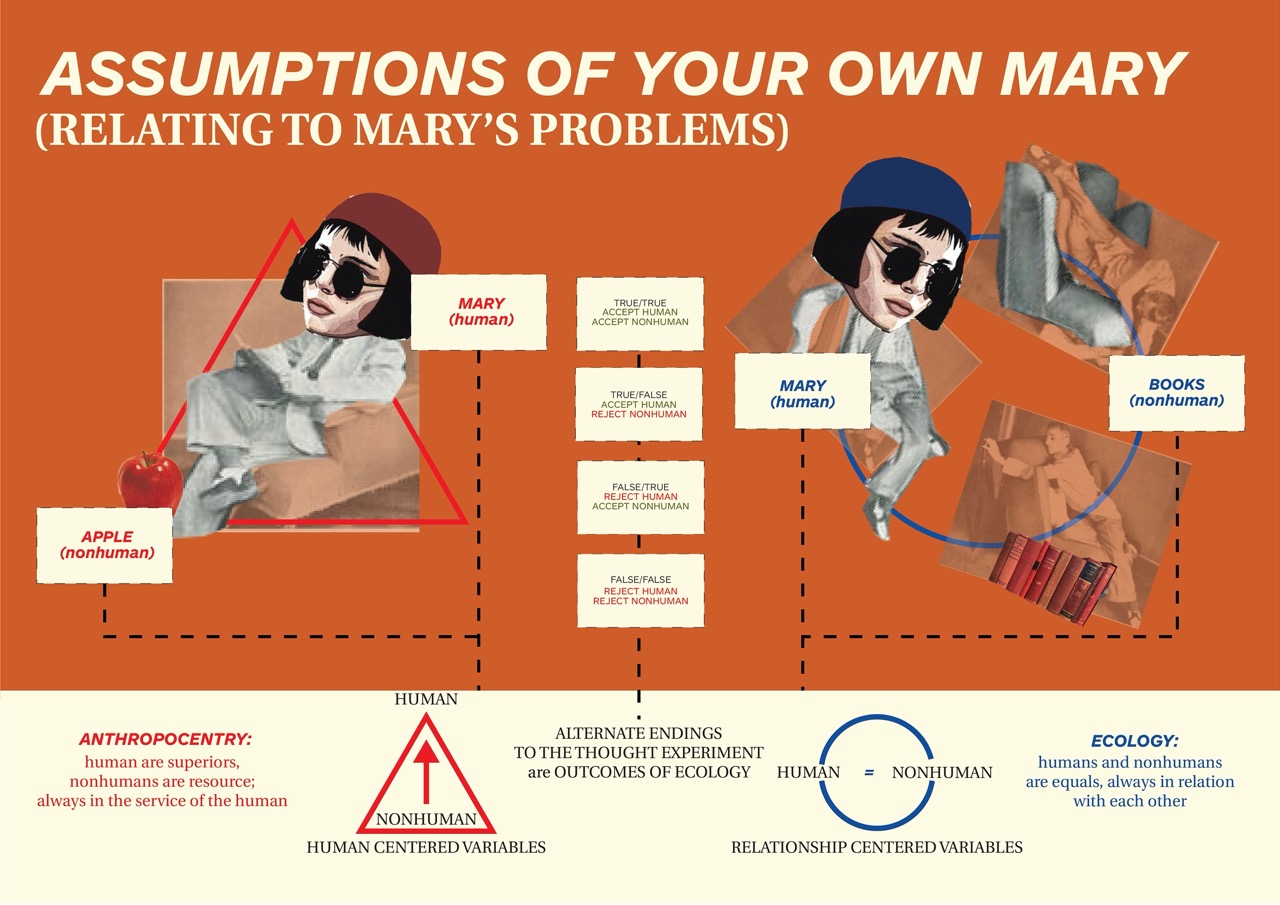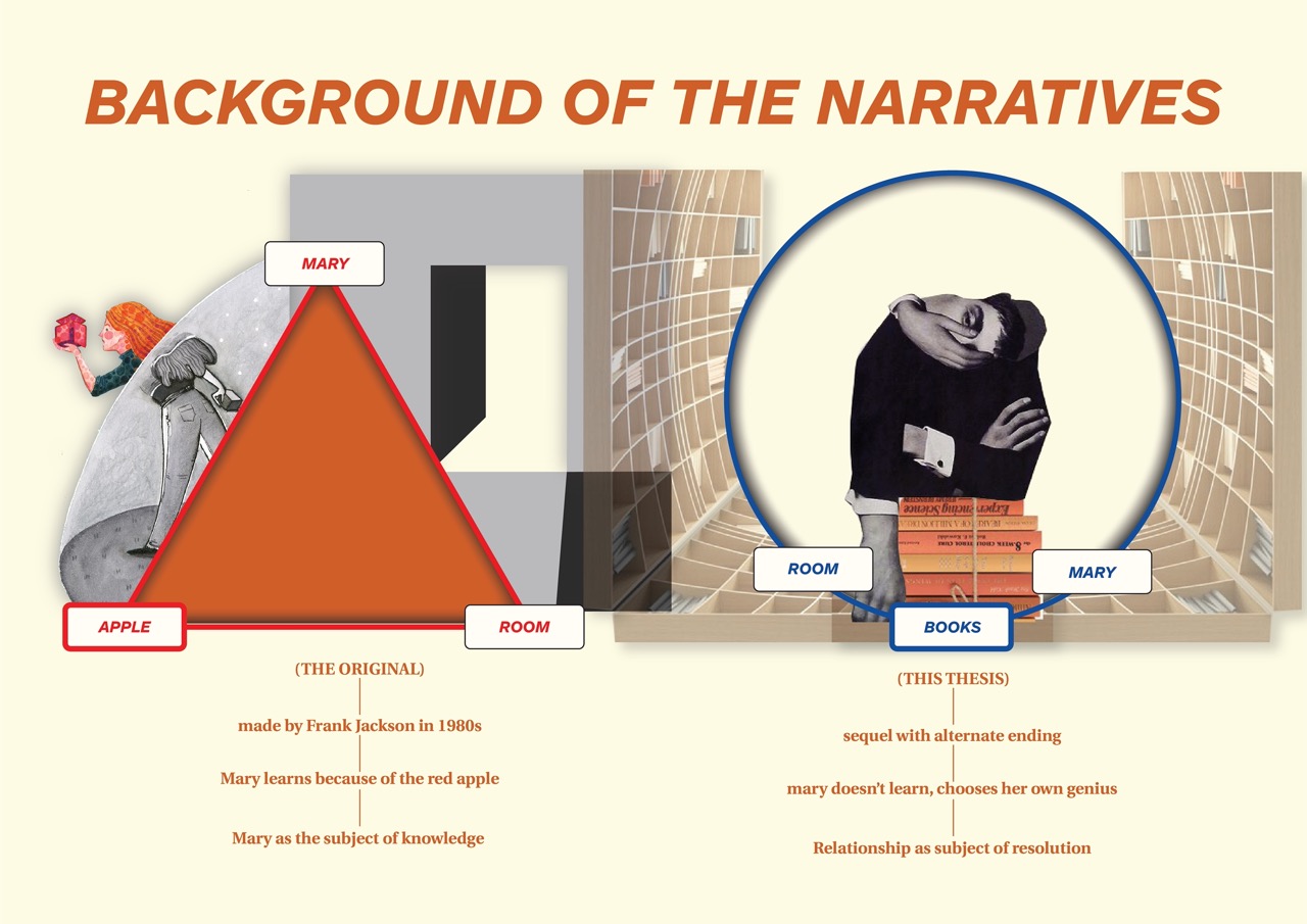 The thesis uses storytelling as a mode of reinterpreting bodies of knowledge. Conversations with Mary is based on the original thought experiment but with its own twist. It encapsulates a great deal of architecture theory and diagrams it according to a spatial output.