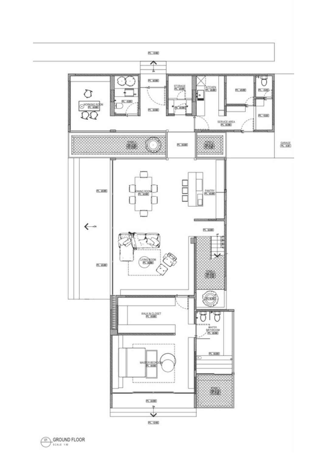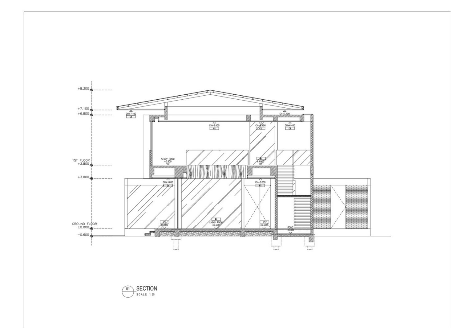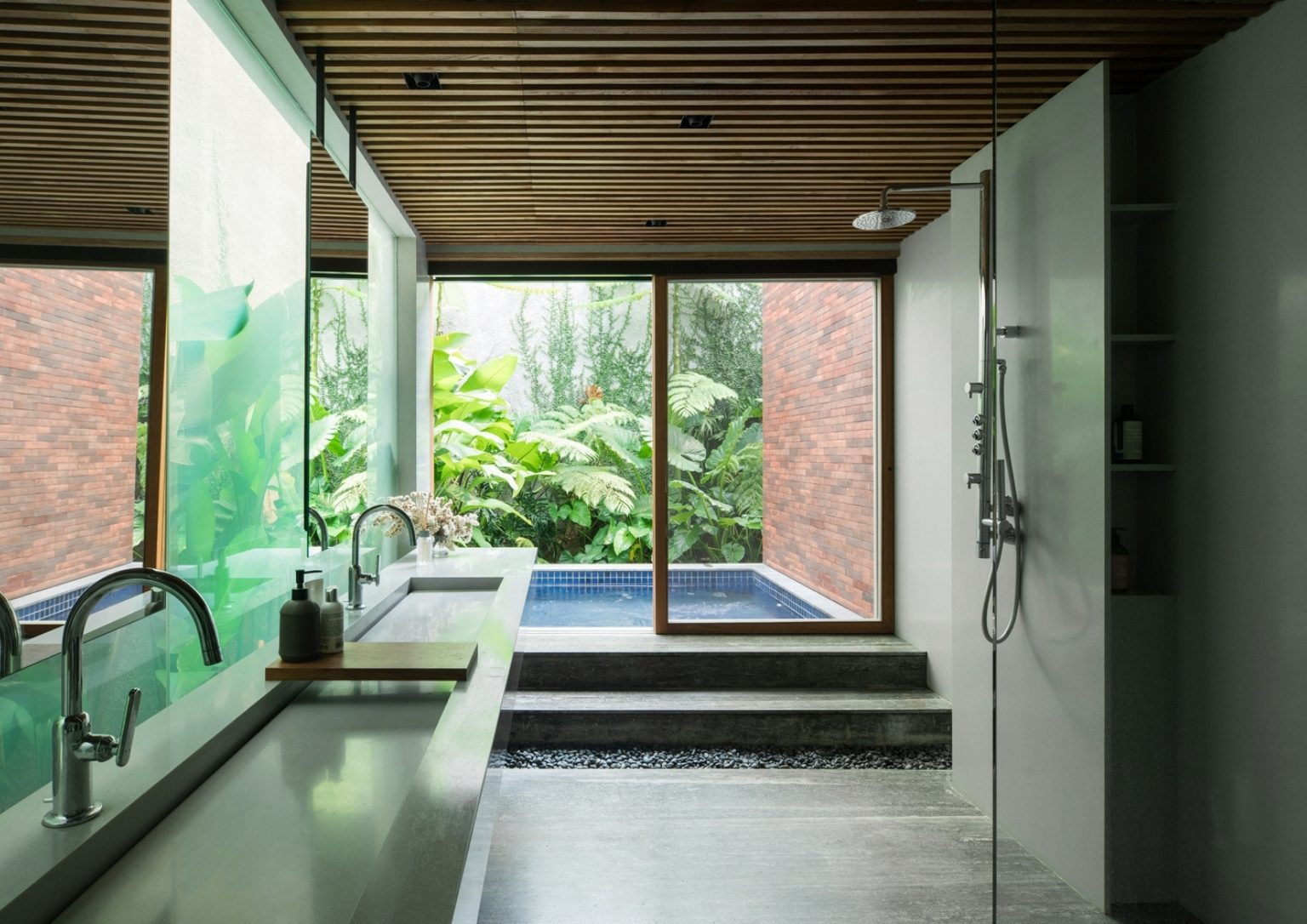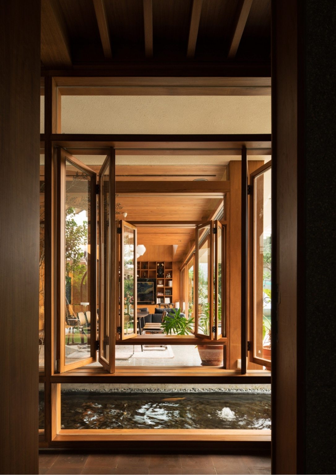 Three masses make the 450 square meter house. The front mass is a rectangular brick facade with a wooden ceiling that contains the garage, service areas, and working room. The bridge across a linear pond creates a transitory journey to the second mass where the central area is. This space includes the pantry, dining, and lounge room with massive sliding glass doors. The glazing unites the communal interior regions to the semi-outdoor terrace that overlooks the inner court with greenery. The large opening in each room maximizes air circulation and natural light.