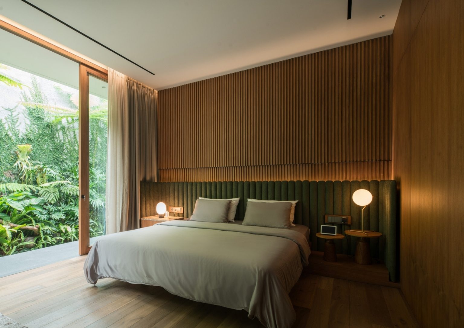 The creatives conceal a master bedroom behind the wooden shelves. This room has the utmost privacy due to its tucked location and is endowed with a lush green backyard. Another well-crafted hidden concept in this area is the bathroom, whose doors are part of the wardrobe panels. Full glazing with sliding doors also merges the bath area with the outdoor pool.