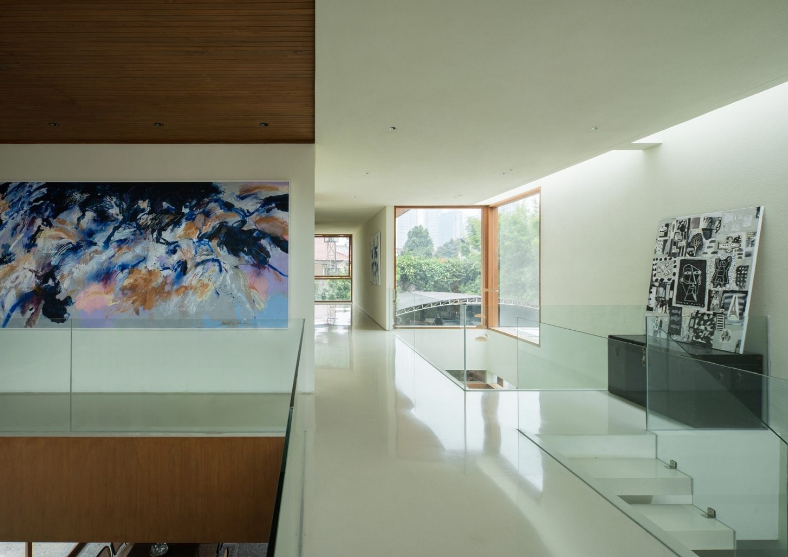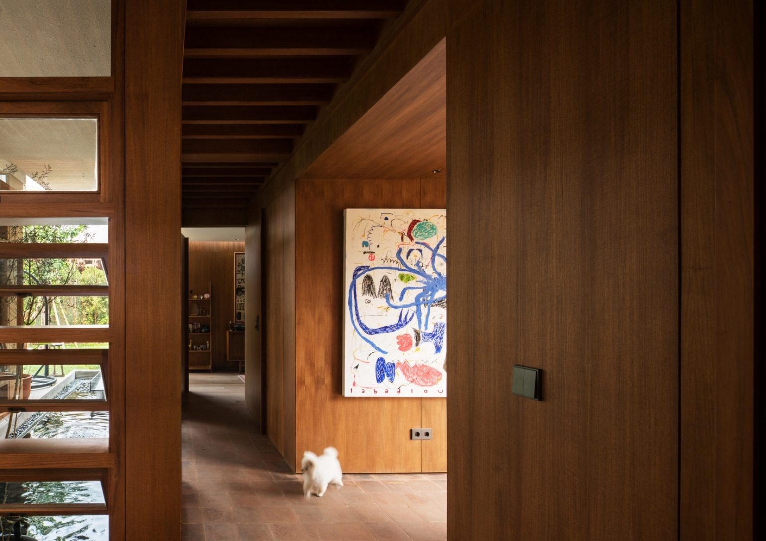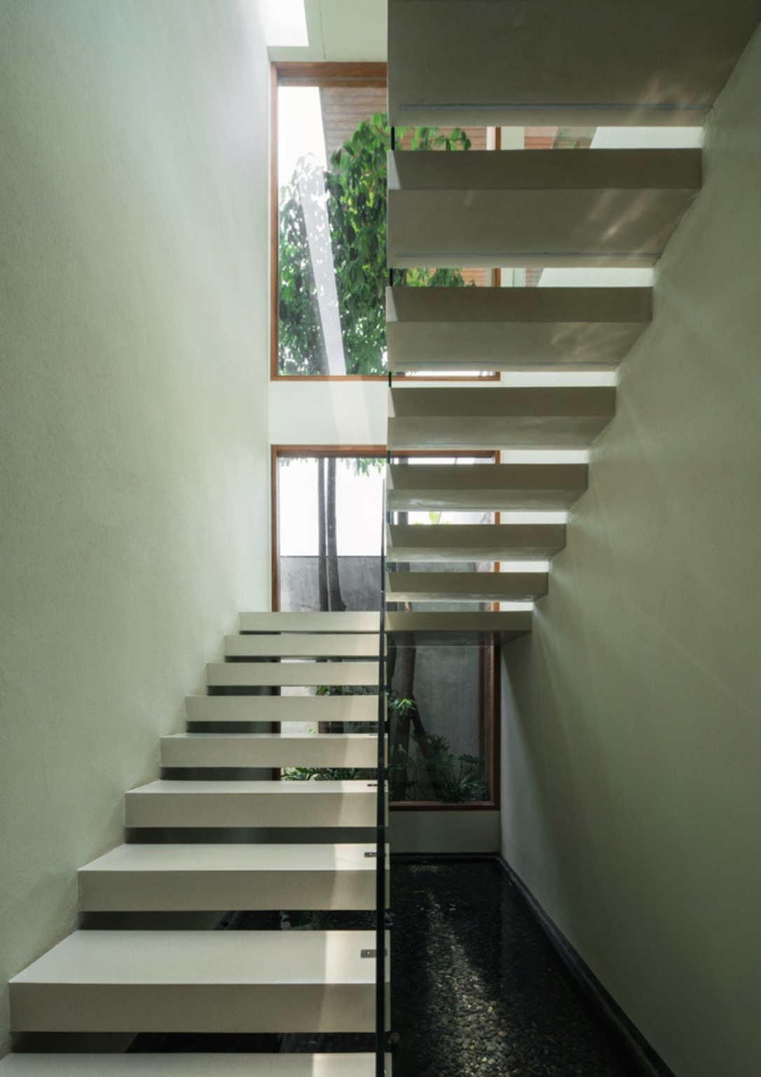 A reflective pond is underneath the floating stair connecting the ground and top floor. Moreover, the linear skylight above the stair’s ceiling adds to the inside-out theme. These steps lead to the third mass or the top floor, where the kid’s study and bedroom lie. The big open area stitches the floor levels together, allowing cross ventilation and organic light in the built structure. Here, the interior’s highlight is the floor-to-ceiling square shelves that function as a display fixture while giving shade to specific areas on the top floor.
