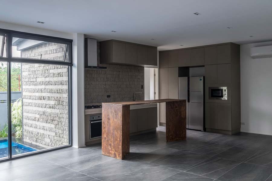 The client’s taste in flora is evident from the soft landscaping around the house. Lino is full of praise for the client’s enthusiasm and execution of this portion of the design, which complements his rigid, cubic architecture. Cogon grass, which was difficult to source, has been judiciously planted across the sharpest lines along the front elevation, cushioning the mass of the house as it meets the ground. Windows looking out from the living room, kitchen, and bedrooms have views of a variety of plants, punctuating the monochromatic palette with moments of color.