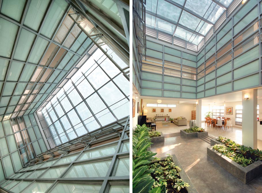 The entire house is designed for passive cooling. Louvers near ground level admit cool air while an enormous atrium at the center of the house gives hot air a place to escape. Lim’s original vision was for the atrium to be open but the design was too hot. He opted to use three layers of landscape fabric (the kind used in nurseries for tender plants that cannot tolerate strong sun) to cover the void. The effect is a soft, filtered light—not unlike the shade of a large tree.