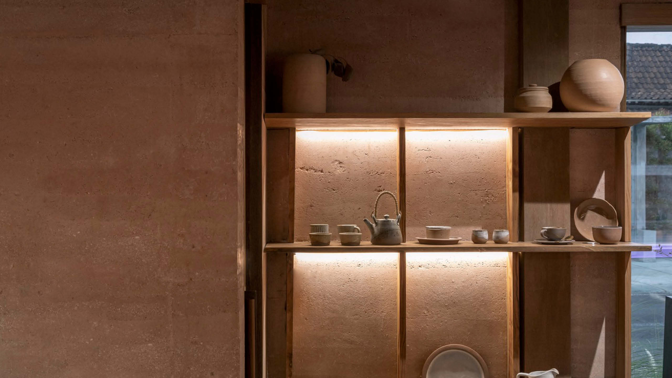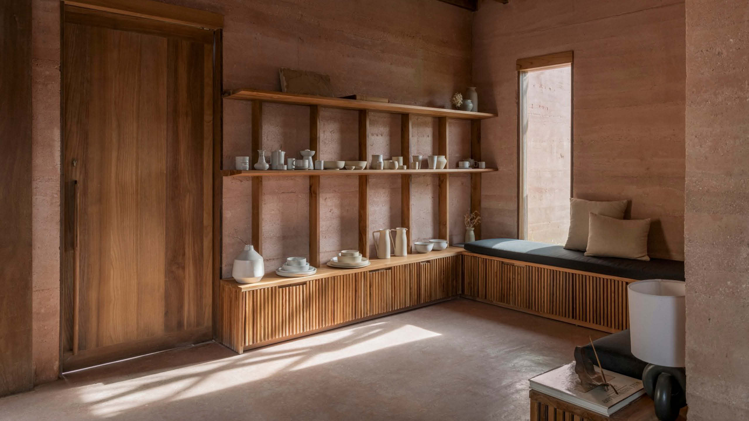 The rammed earth walls are also mixed with some of the studio’s crushed terracotta tiles.
