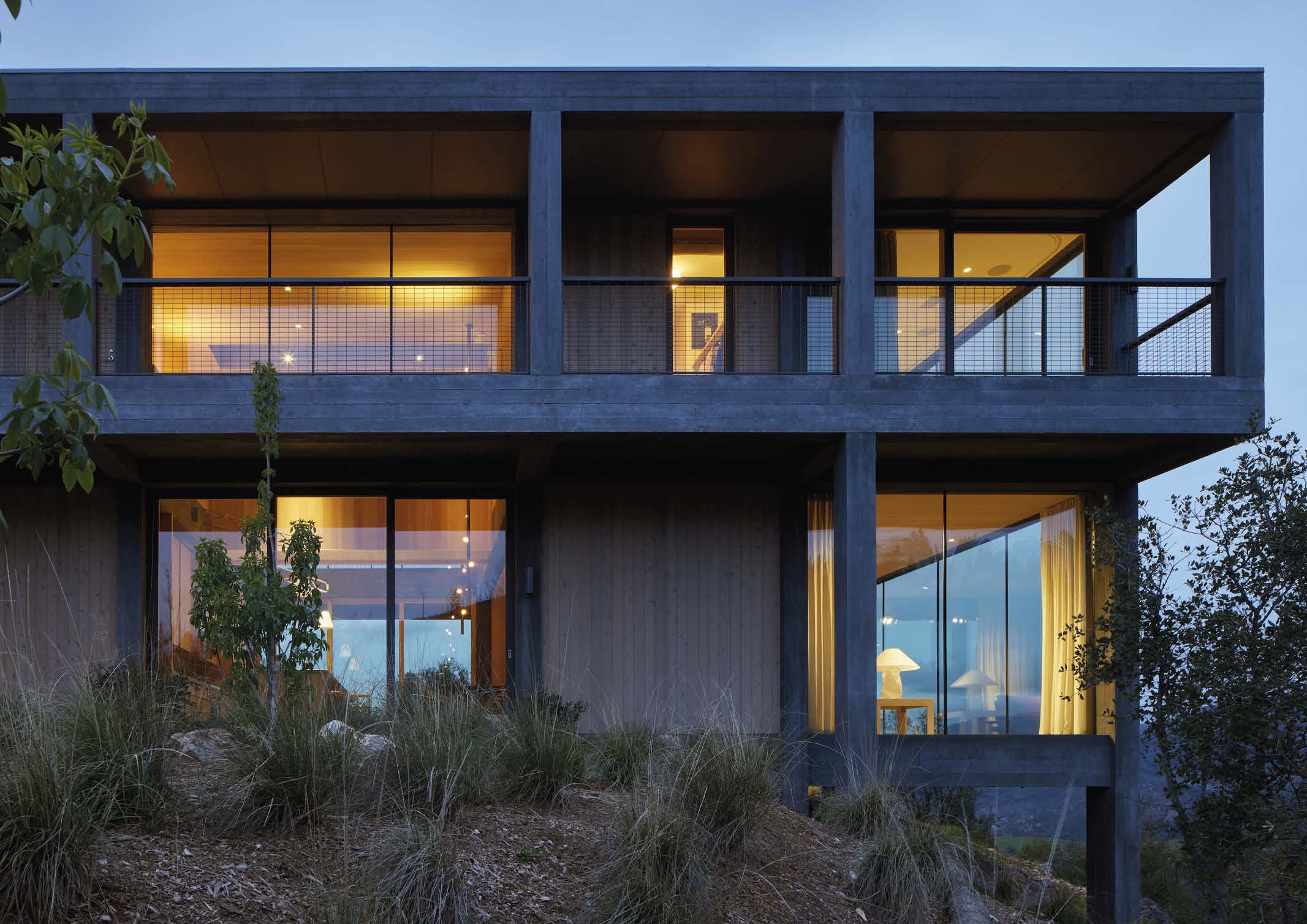The materials used for the house are strategically placed according to its environment. The architects explain that all materials that face the natural environment are intended to resist the potential of wildfire: concrete structure, concrete masonry unit sheer walls, cement panel soffits, and non-combustible roofing material were chosen to armor the exterior. Windows are metal clad on the outside, though wood clad on the interior.