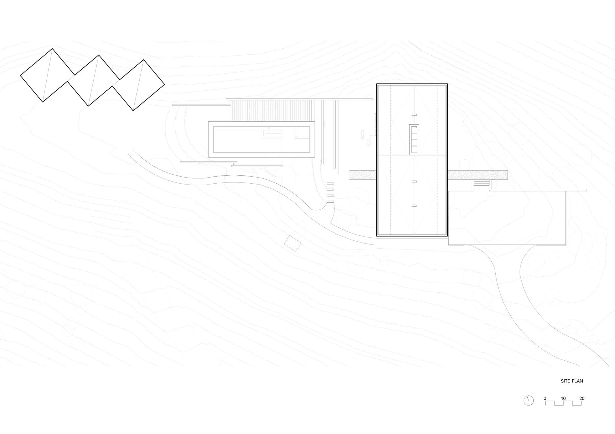 The property’s grading, drainage, and planting strategies maintain the original topography, prevent erosion and disperse rainwater in in-grade dissipation pits. Softscape and permeable surfaces were used wherever possible within the site design to allow rainwater and irrigation water reabsorption onsite. All irrigation is from an on-site well.