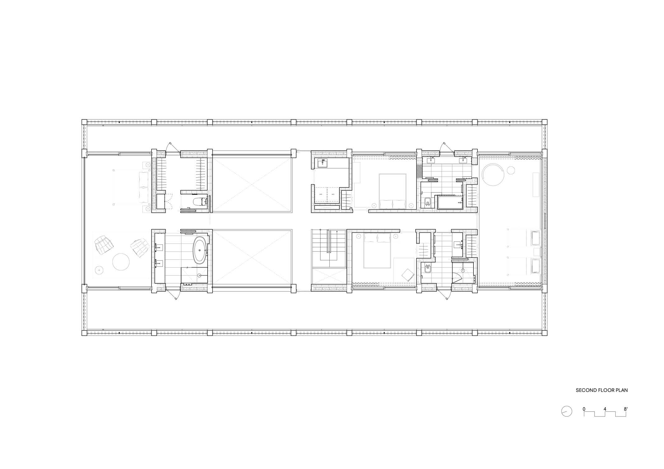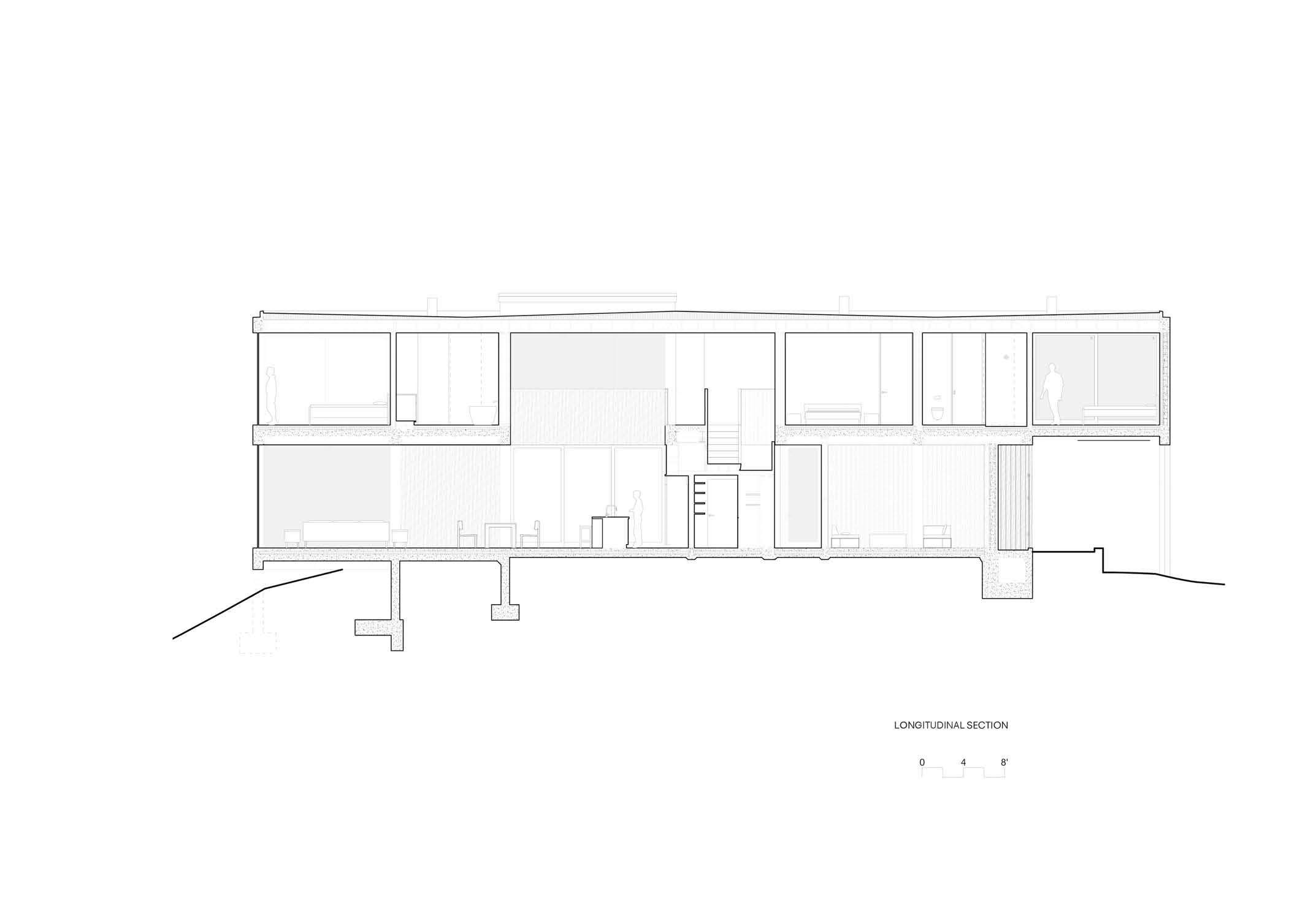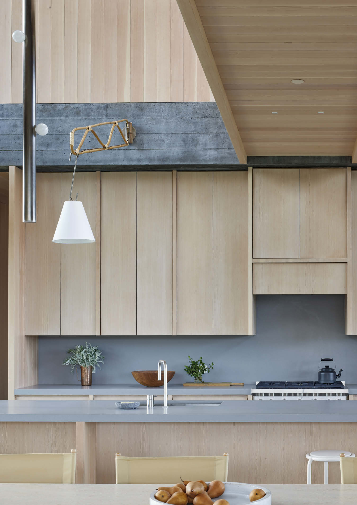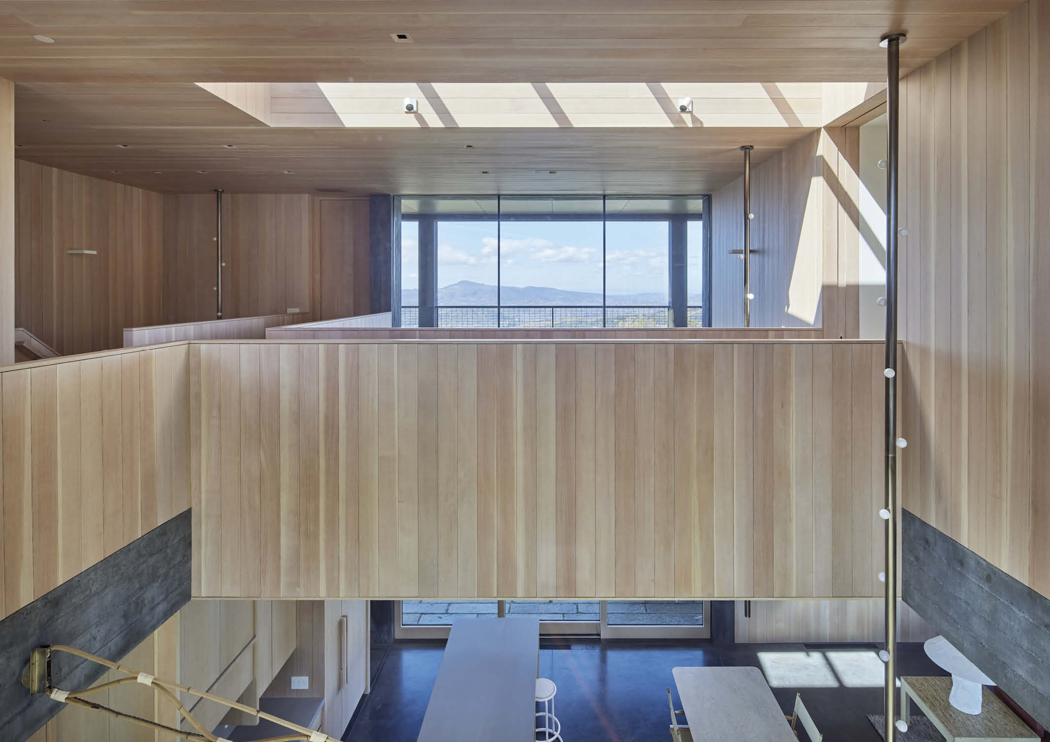 Furthermore, a catwalk, illuminated by a linear skylight, connects the two bedroom wings, which have painted gypsum board walls, wooden floors, and doors, and are dotted with wooden wall sconces reminiscent of mid-century California craft design.