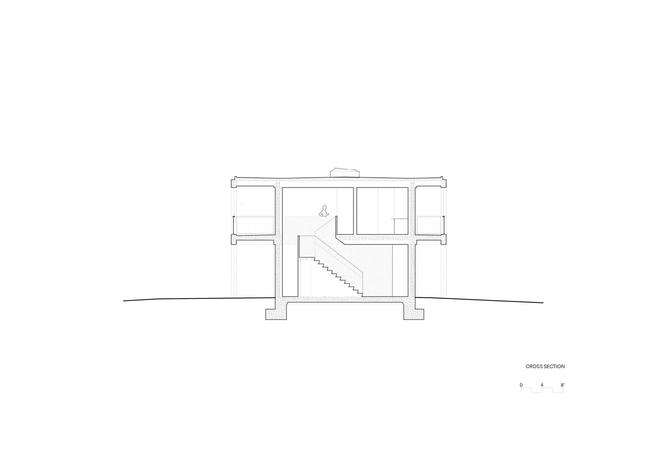 The Northern, Eastern, and Western frontages of the building are defined by expansive glass openings, allowing for a sense of continuity with the outside environment as well as ample natural light. To mitigate major solar loads, deep concrete overhangs shield the windows along the Eastern and Western frontages and the Southern facade is entirely opaque. This creates a well-calibrated balance of natural light to shade in both levels of the home.