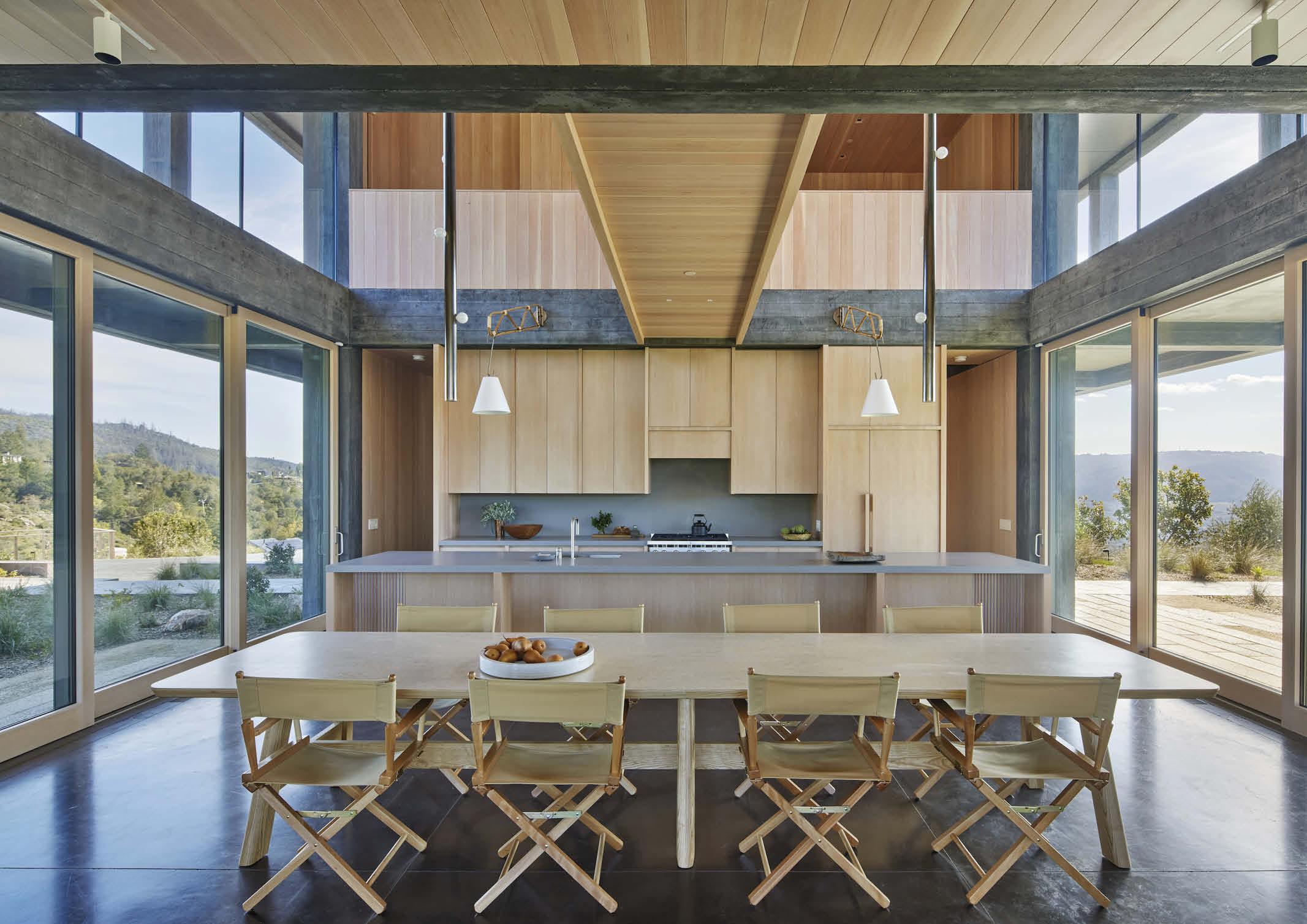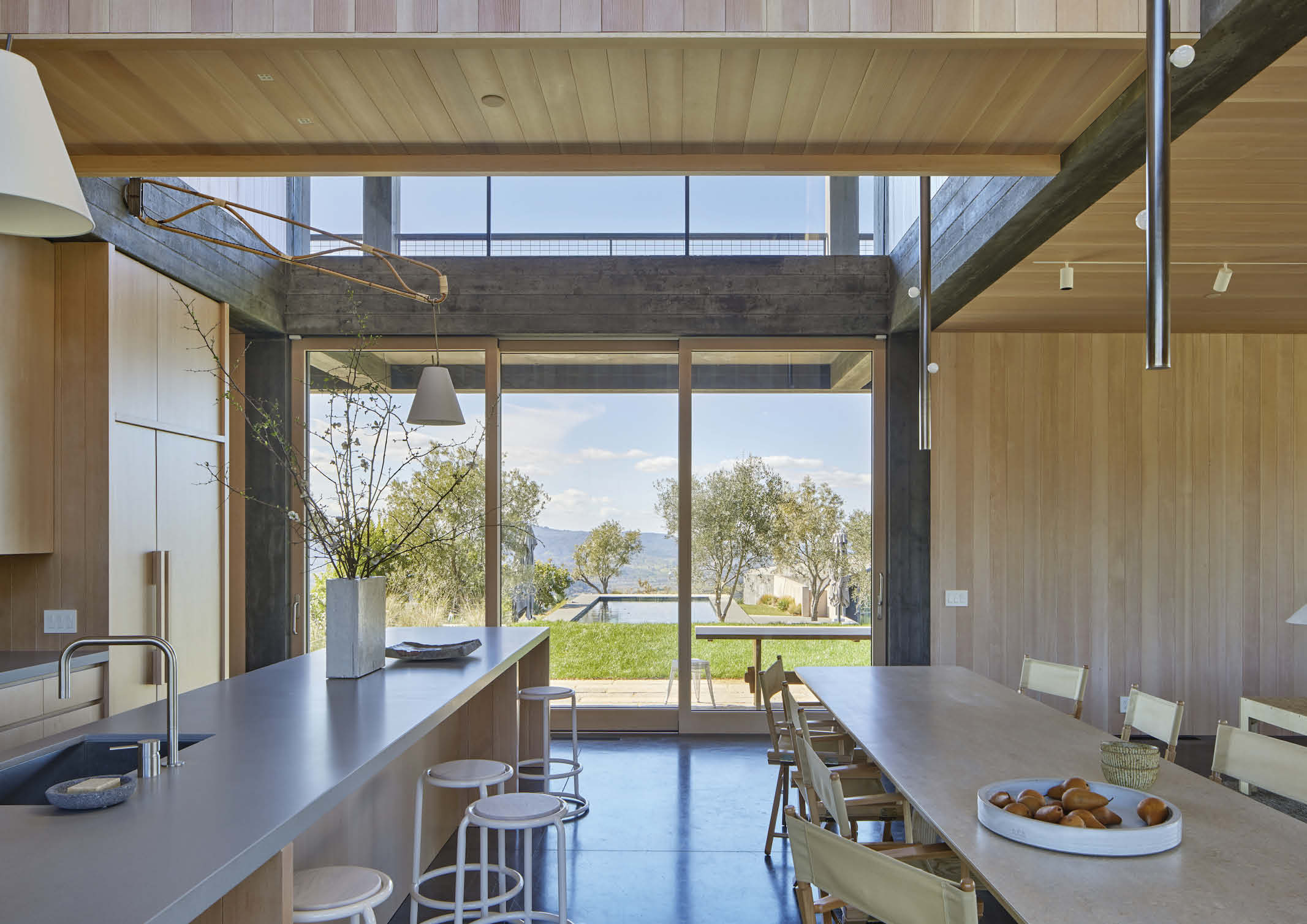 “After the Nuns Fire of 2017 ravaged the surrounding area and damaged the property, the clients asked us to design a new house that would be armored against future wildfires,” says lead architect Casper Mork-Ulnes. “The concept was to design an all-concrete house that is wrapped in a sacrificial layer of wood that gave a nod to the local vernacular farm structures in the area – so that its materiality still feels like it fits with a Northern California home despite being structurally concrete.”