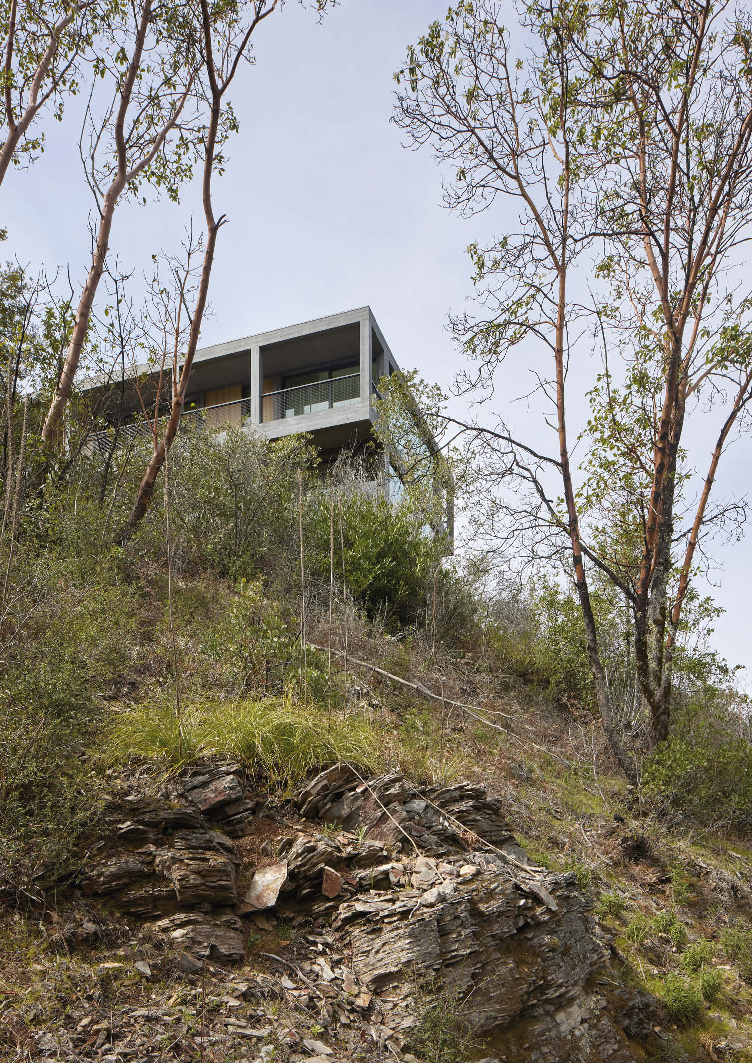 In response to the client’s request, the architects came up with a simple, two-story concrete structure based on a three-dimensional grid. Firmly planted on a plateau surrounded by Manzanita groves and pine-forested hillsides, the house sits right above the pool area and the previously completed concrete guest house.