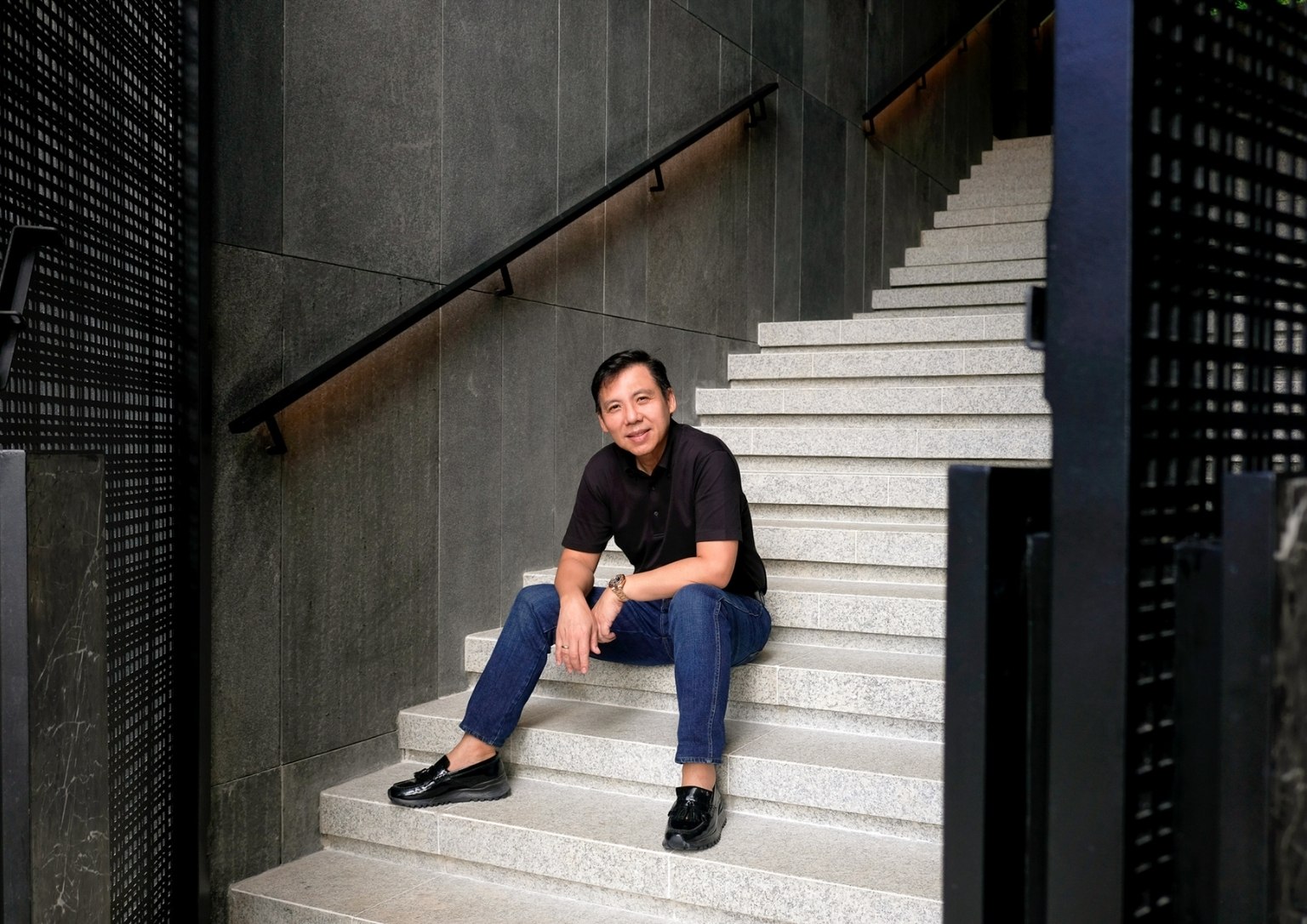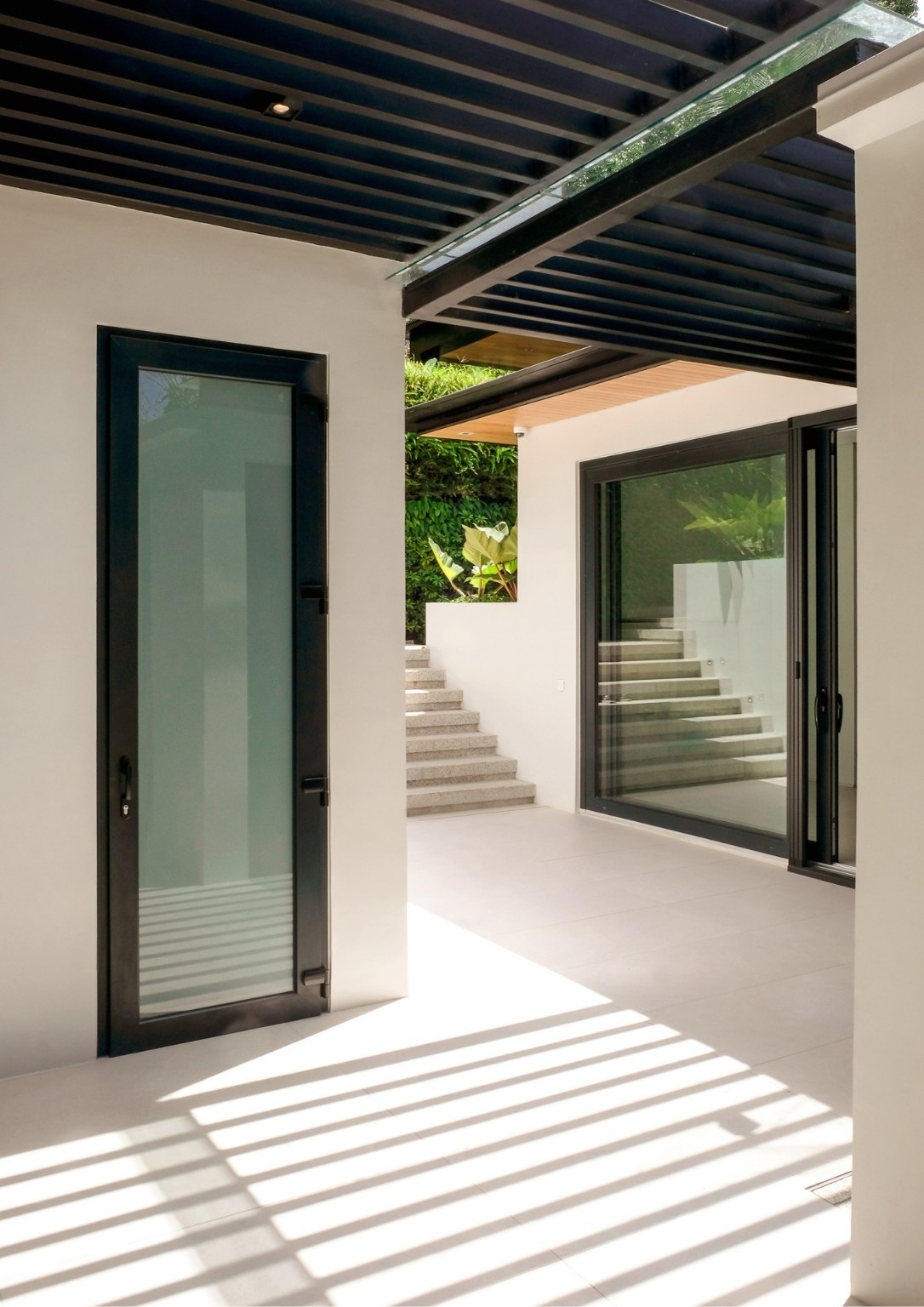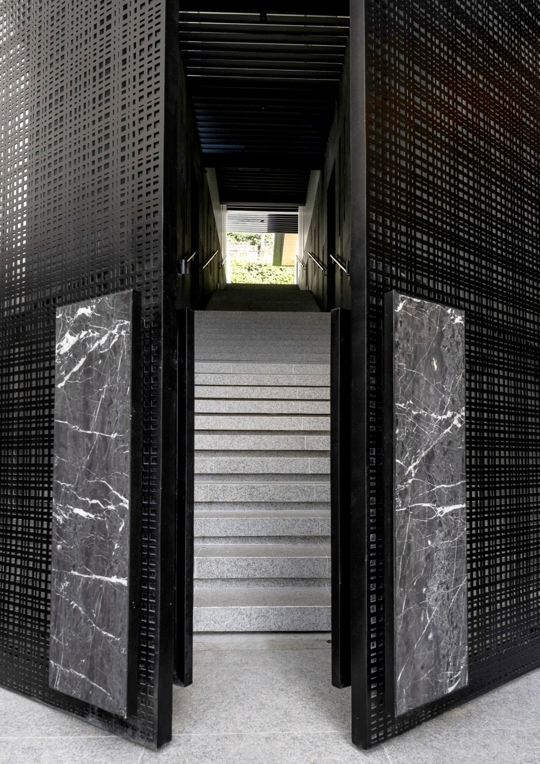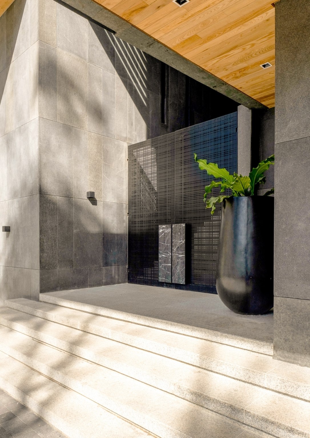 “As you ascend The Perch, you will notice that it is a space made of a singular material: just black granite, with a very minimal black hand railing that we placed lights in. This created the perception of a vast, dark void with a sliver of light at the very end. We wanted that to be the pull,” he poignantly described. “With that light at the very end, you momentarily see greenery, which I felt was something the team and I wanted to highlight. It creates a visual draw. That’s essentially how I wanted to address the issues that I was dealing with for The Perch, which had an unusual topography for a house.”