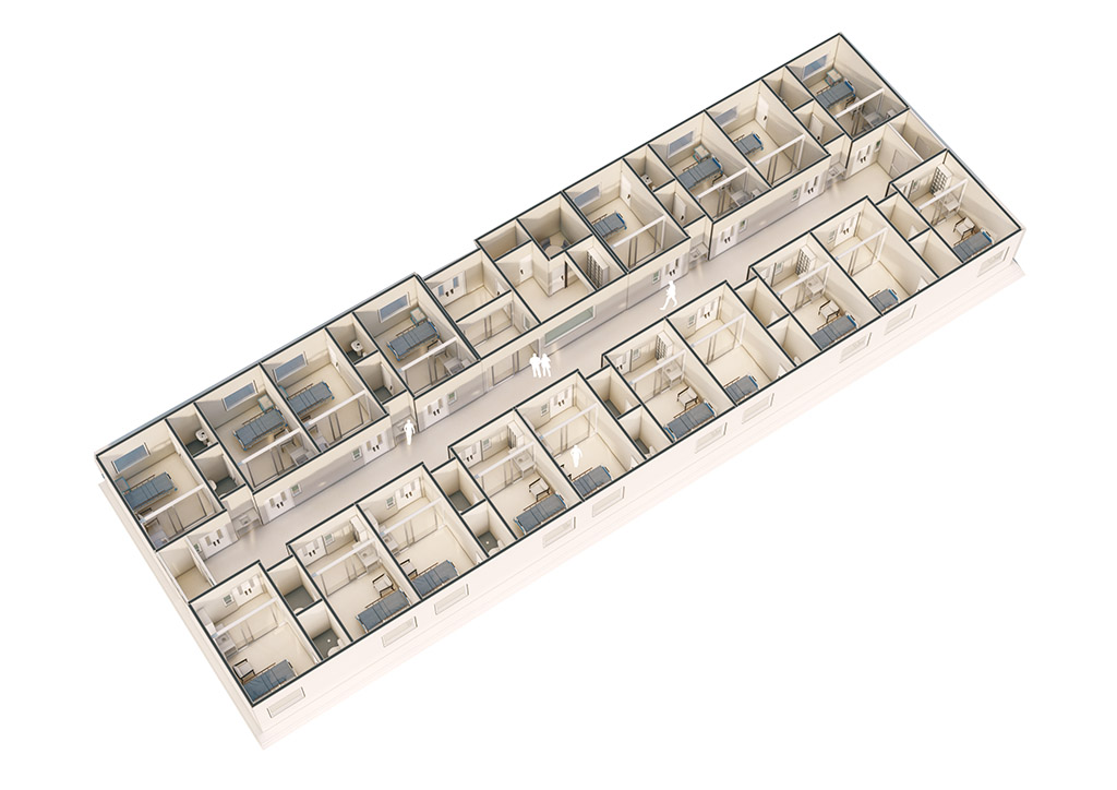 Each Rapid Build Hospital Isolation (RBHI) unit is housed in a one-story building with 18 isolation rooms. Each RBHI Unit measures 12.8 meters wide by 38.4 meters, giving it a building footprint of about 491 square meters. John Ryan Santos + Partners’ idea is to build these healthcare facilities in the open areas within the complexes of public and private hospitals. “We thought of RBHI as a means of increasing the capacity of COVID-19 centers and hospitals,” says the healthcare architecture specialists. According to them, existing hospitals can build one or several isolation facilities, depending on their available space and demand. The number of rooms can also be adjusted depending on how many beds are needed for isolation. Apart from having a separate, standalone building ideal for isolation, having these RBHI units near hospitals will aid in carefully monitoring the number of cases within a specific area.