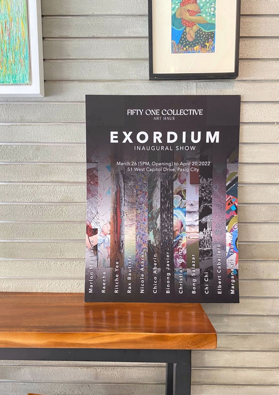 Titled Exdordium, the inaugural show gathered twelve artists of varying notions, concerns, and techniques. The show features the works of Chico Aberin and visual artist/interior decorator Nicole Asares. Rax Bautista a photographer, fashion stylist and creative director is present as well together with abstract painter Elbert Caballero and expressionist Raech Dacanay. These artists have proven their tenacity in the often turbulent Philippine art landscape. Their works reflect the ever-evolving norms of creativity and aesthetics.