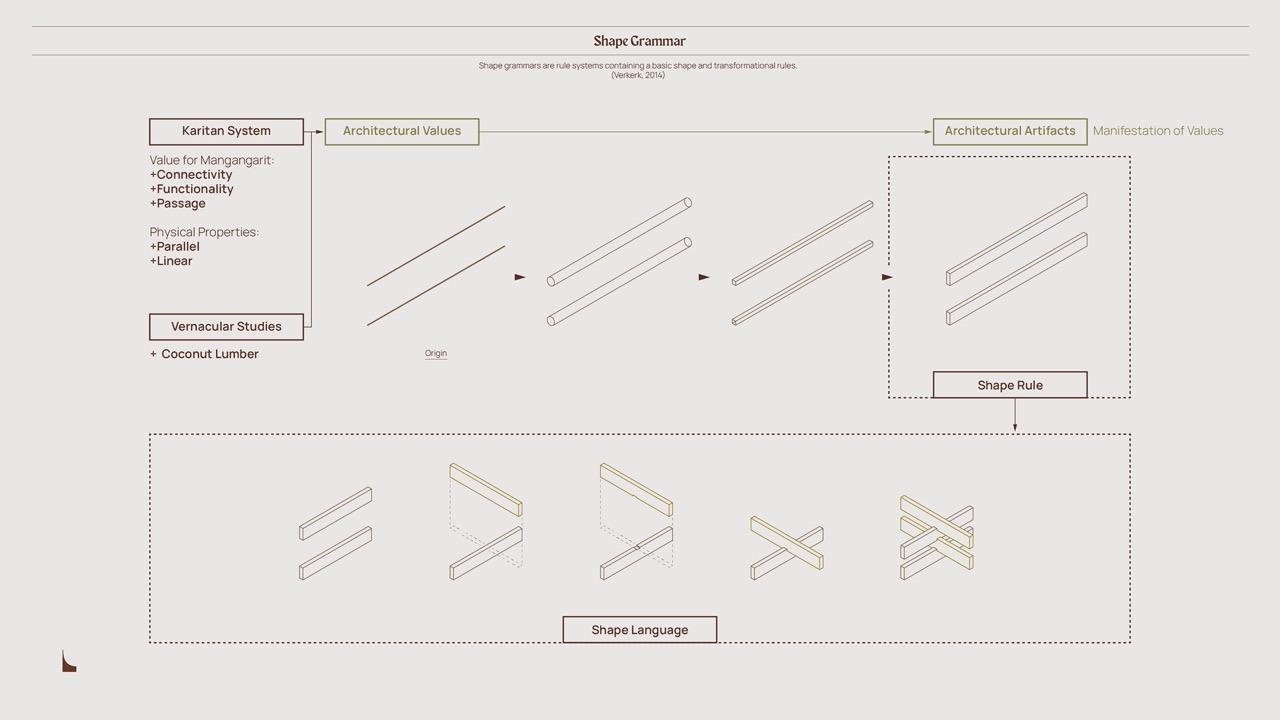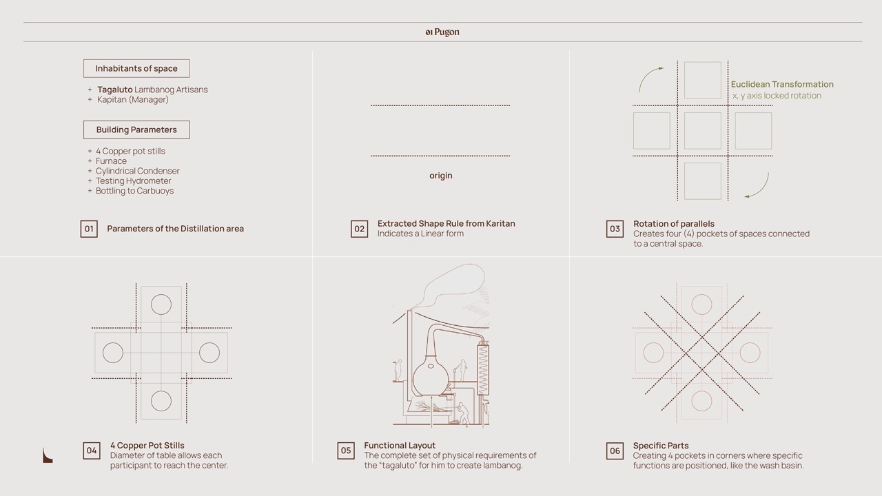 In line with the Design Exploration program, Lance Sy starts his design process with identifying the authentic elements that make up lambanog culture. The goal is to create a production typology that reaffirms its territorial identity. It uses the drink as a means to provoke topophilia and terraphilia, the love of one’s environment and locality. Three models make up the framework used to inform the design: the socio-physical model of interrelationships, the Identerra model, and the Vernacular Value model.