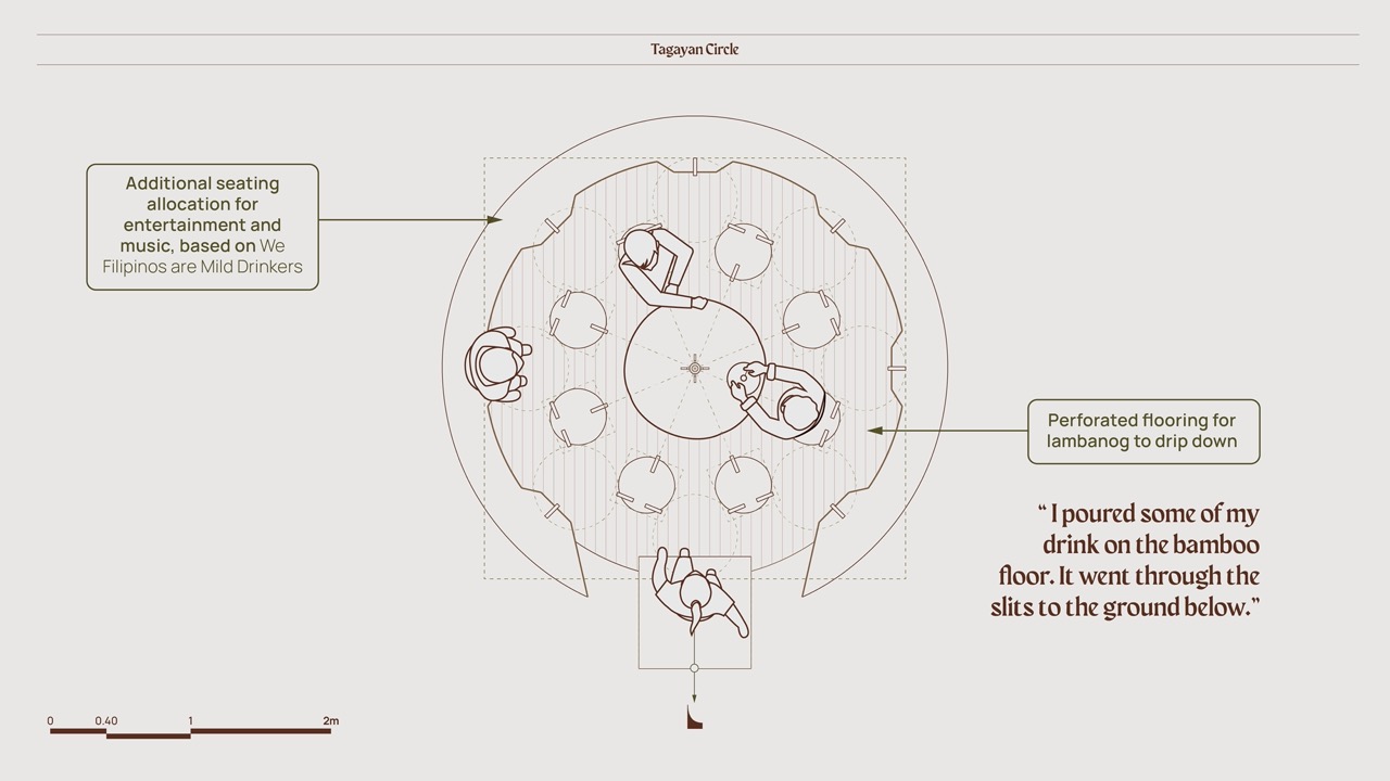 These are the Pugon, the place where artisans create and work with lambanog. The tagayan is where the drink can be enjoyed with its traditional means of enjoyment. Lastly, the tahanan is the residential and hosting component to the design. The arrangement of these spaces form an experience to encounter the drink in a holistic manner. The design supports the process of making lambanog from fruit to bottle. An in-depth study into the workflow serves as the basis, and Sy designs these areas with a selection that merges cultural forms with functional requirements.