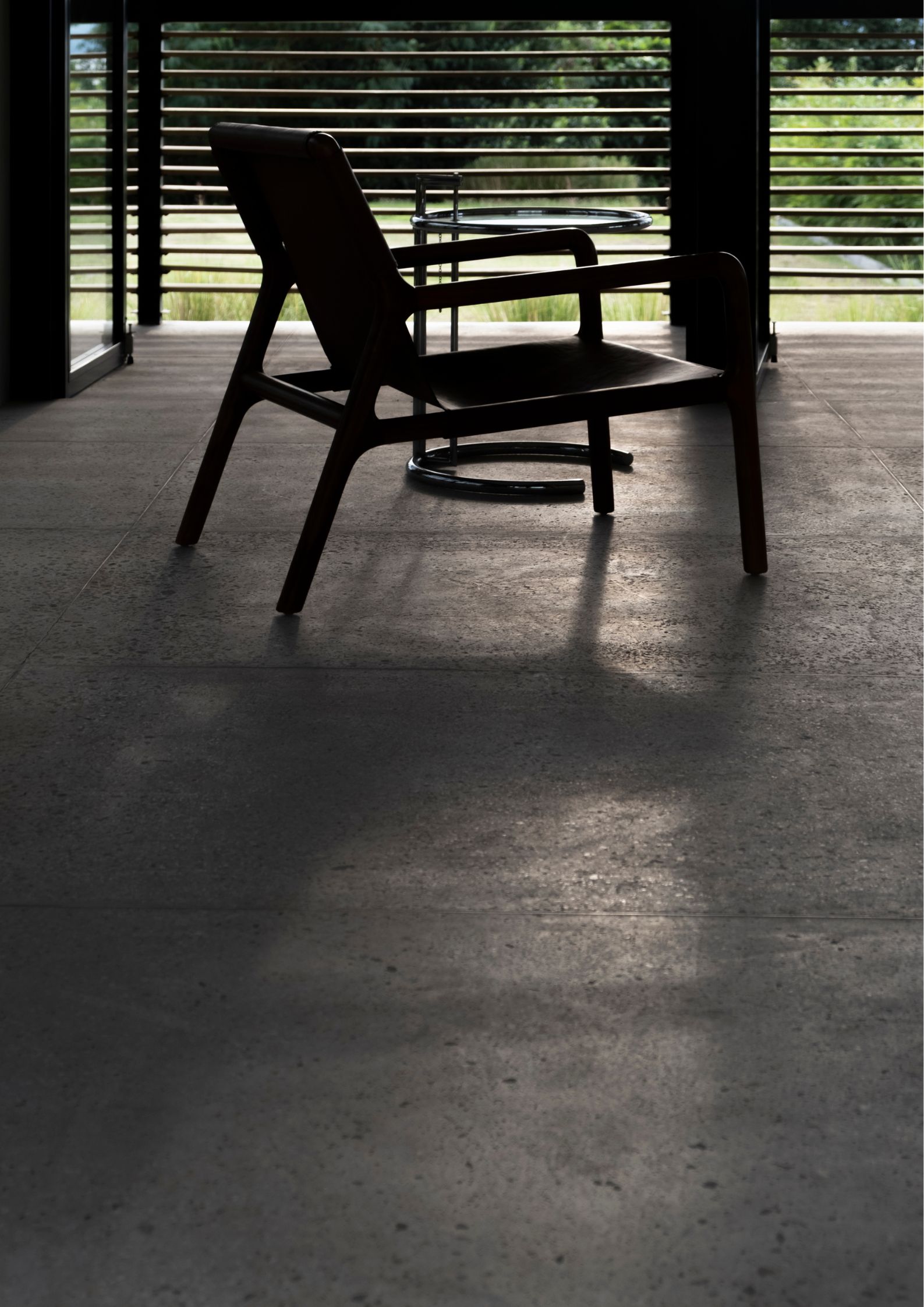 A key architectural feature are the wooded slats made from blue pine. These soften the villas’ otherwise rigid geometry, and their warmth contrasts nicely with the otherwise cold, hard concrete prevalent throughout. The slats also provide various levels of transparency and translucence that creates a play of shadows over the course of the day.