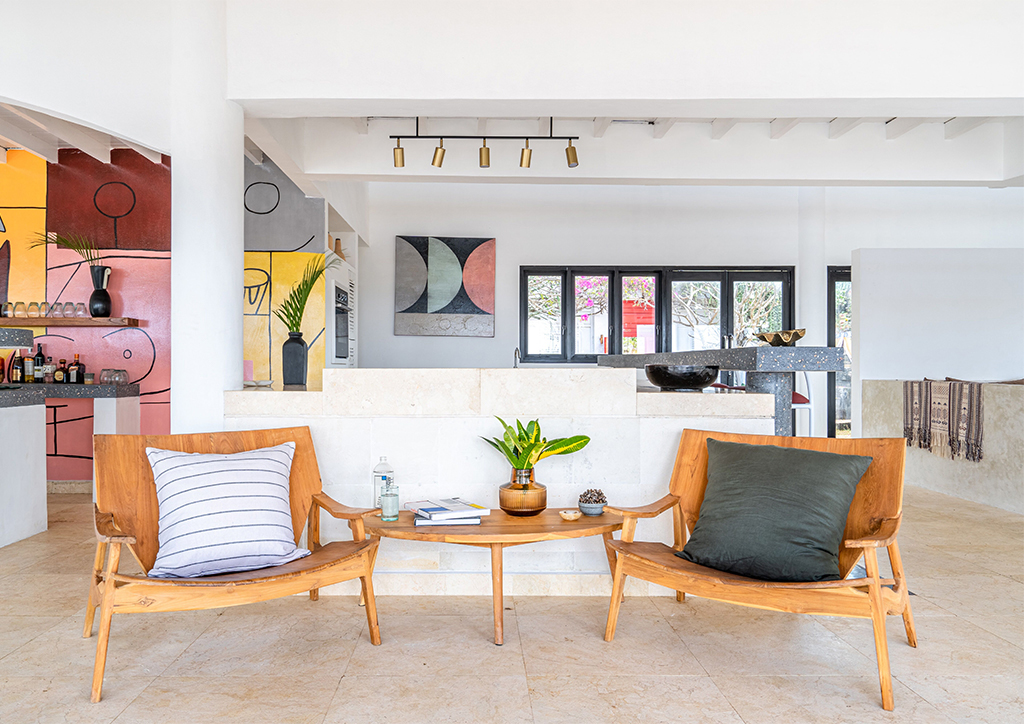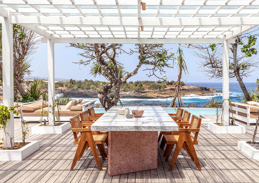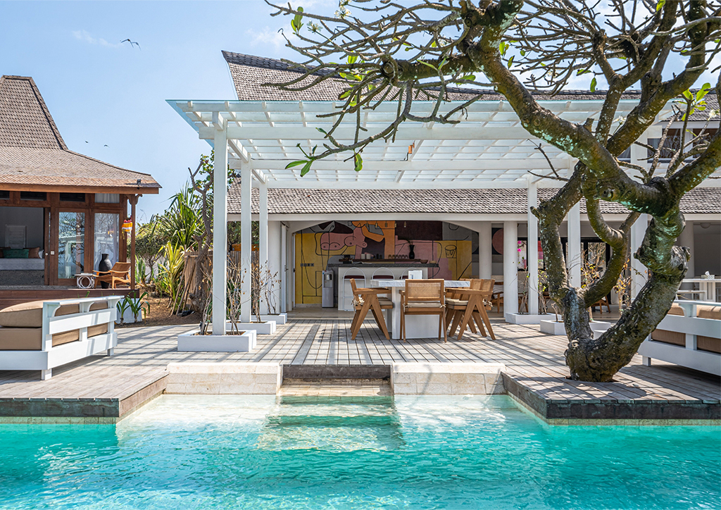 Mandala. The Bay’s design blends traditional Balinese architecture with modernist interiors, finishes, and artworks, boasting five individually-designed king bedrooms spread over 1200 square meters. Indoors and outdoors are seamlessly connected to create large, light-filled, and airy escapes for the cliff-side villa. Stand out elements include a master bedroom housed in a Joglo structure carved from teak, the perfect entertaining space which includes a bar designed to professional standards, an ocean-view swimming pool, lush outdoor bathrooms, and a relaxing library refuge.