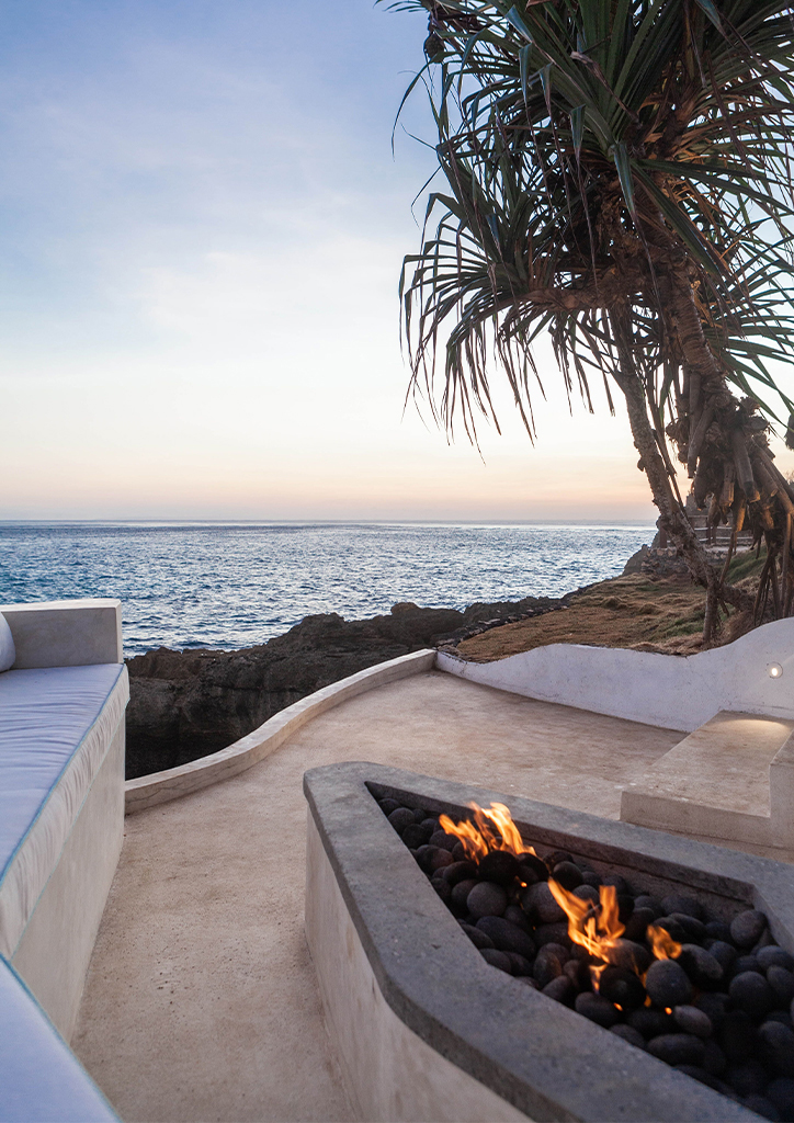 The residence also comes with gardens that are colored with fragrant frangipani trees and bright pink bougainvillea, the perfect setting for long, lazy lunches under the pergola in the outdoor dining area. Towards the cliff’s edge sits a remarkable and unique hidden firepit that is surrounded by banquette seats carved from rock in the cliffside. A feature unlike any other, it offers sunset views and directly faces the wild and dramatic beauty of crashing waves at iconic Devil’s Tear across the bay.