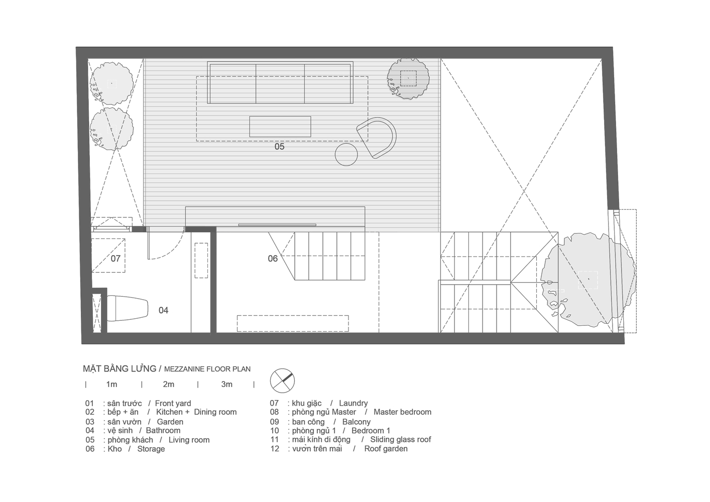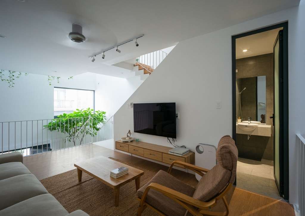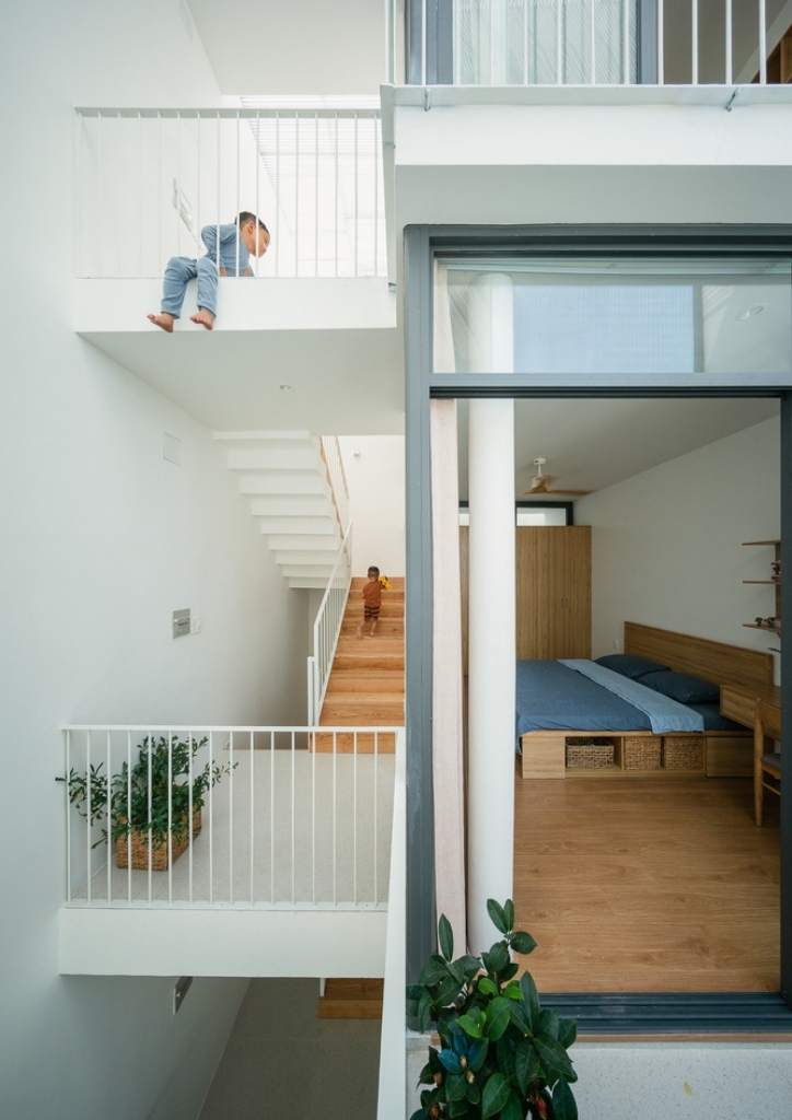 Also, the architects envisioned the project to be both a family home and playground for Bi and Sam. As such, they wanted to help the parents observe the children as they play and explore inside the house. For this, their main concept involved floor areas of different sizes for the upper levels. It allowed them to make room for a large atrium at the front. This area was beautifully lit by the large windows of the facade.