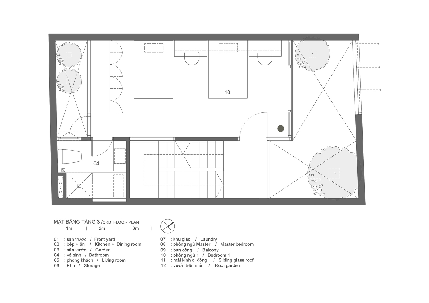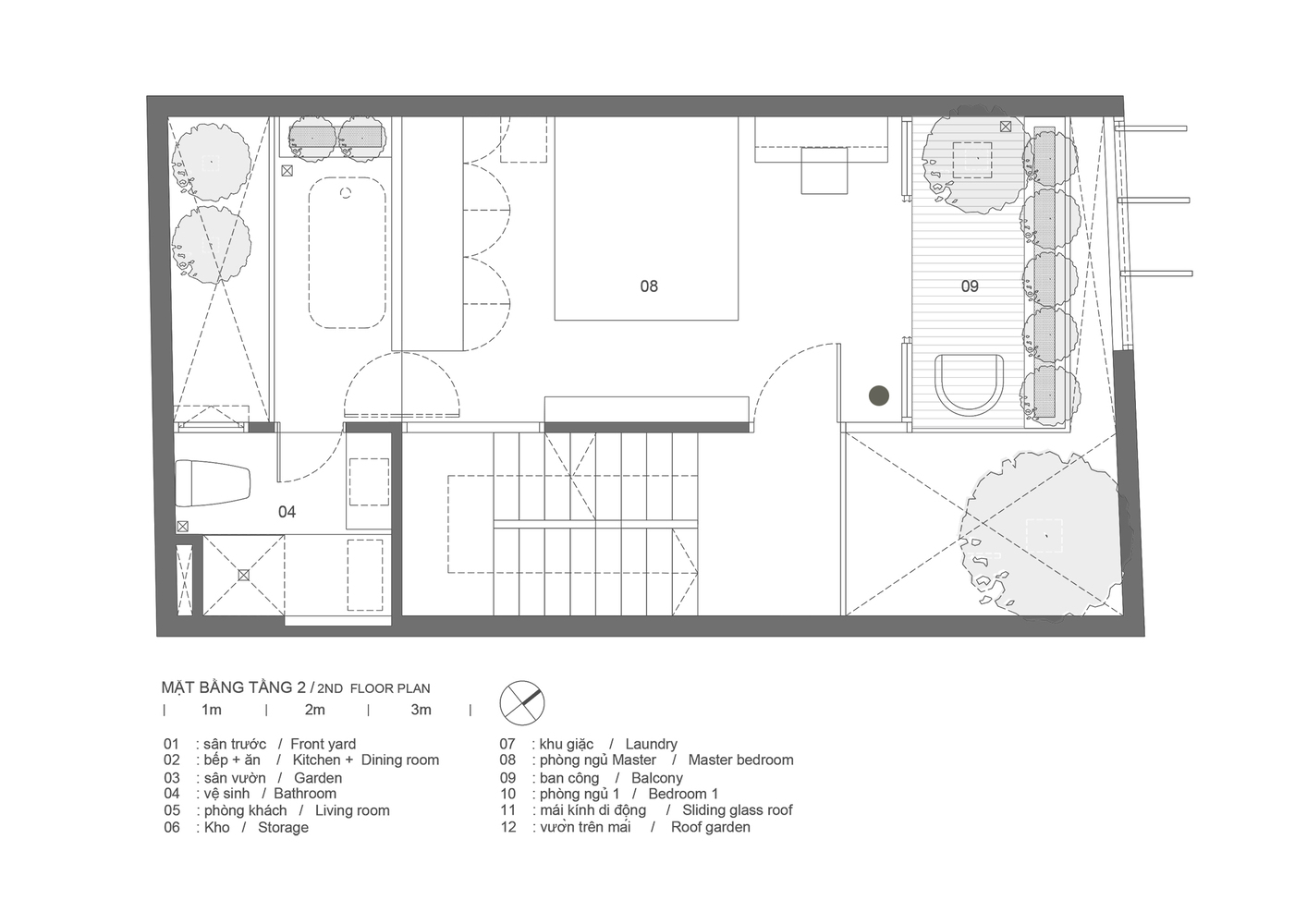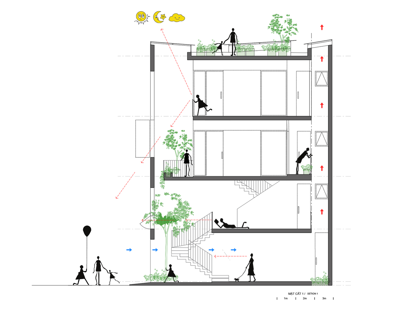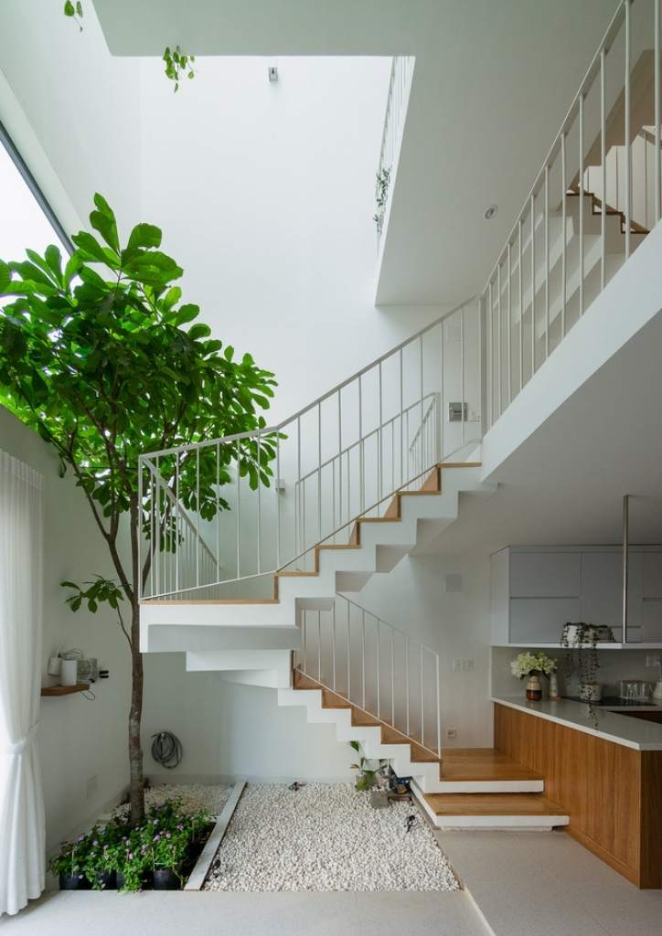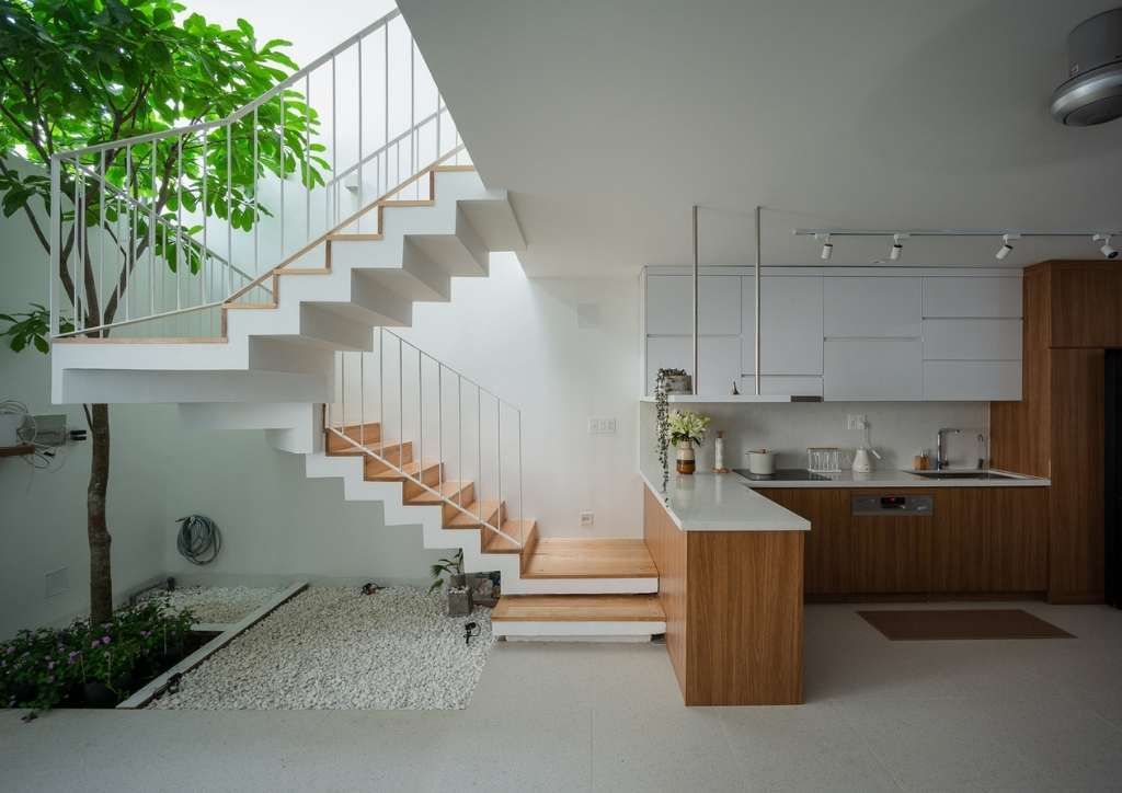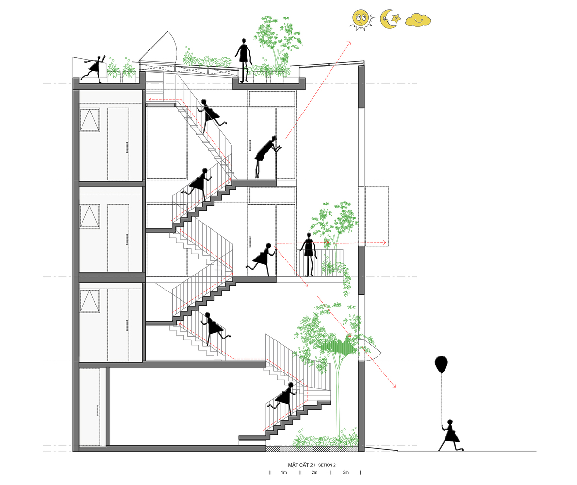 In addition, the architects strategically placed the courtyard and balcony next to the kitchen and the bedroom. This way, the parents have full view of the children playing nearby. Meanwhile, the staircases also provide various stimulating activities for the family. The trees and viewing areas provide areas of interest as they vertically navigate all levels of the house.