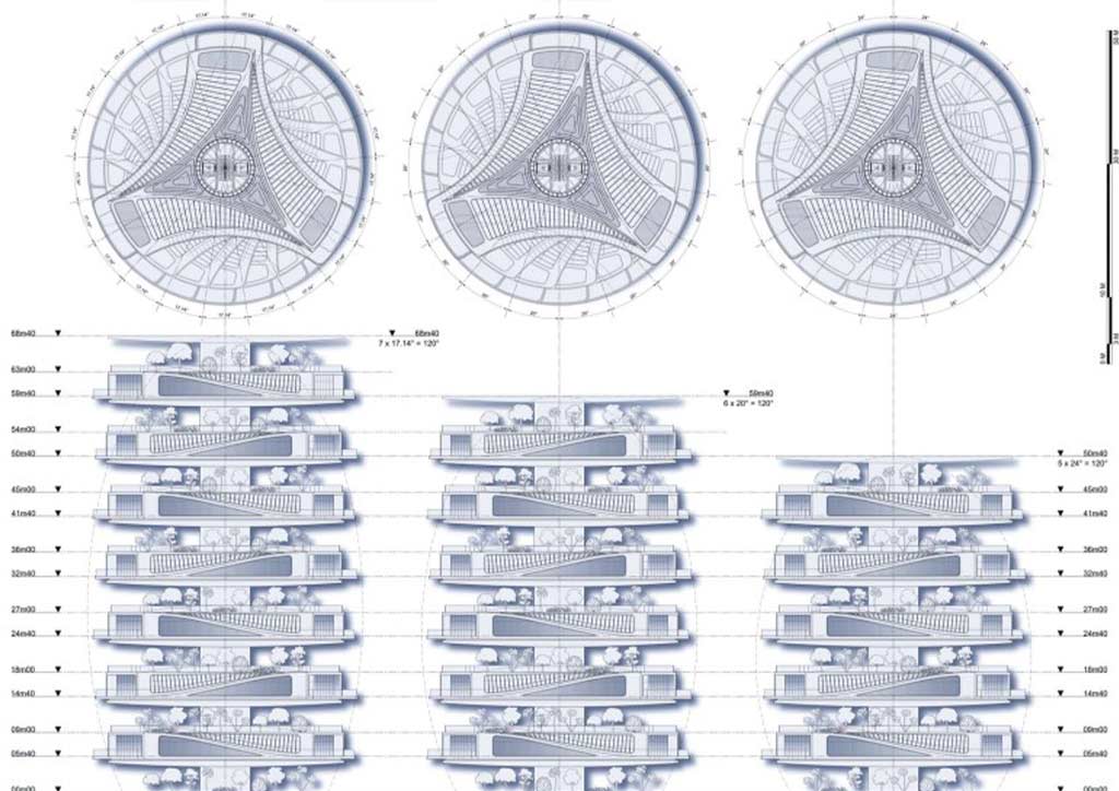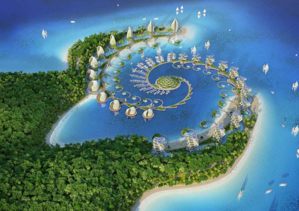 With this objective in mind, Vincent Callebaut drew on the elements of nature found in the Philippine Sea to design Nautilus Resort. Viewed from the sky, the overall structure of the resort complex is a fractal shape that is rolled into itself according to the precise and timeless geometry of the nautilus shell. The buildings placed within this spiral are also designed to mimic the structure of shells, which decrease in size as you get closer to the center.