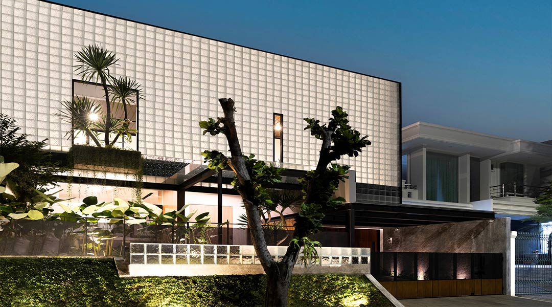 Located in Jakarta, the Refraction House exhibits a stunning façade composed of different glass blocks combinations, creating a unique landmark within the neighborhood. Lead architect Antonius Richard of RAD+ar, or Research Artistic Design + Architecture, had to address design constraints of the existing house that is situated in a long deep lot that’s also facing east and west which is not favorable to achieving sustainability in tropical countries like Indonesia. By reversing the site orientation’s weakness into a more beneficial characteristic, the strategic placements of glass blocks from the front all the way to internal open areas ensure maximum lighting to penetrate every corner of the house. As the light within increases, the heat transmission also decreases by being airtight reducing heat transfer, unlike the regular windows.