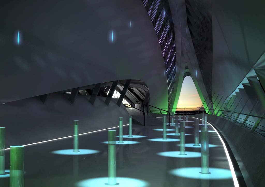 The structural problem was then addressed by the installation of 68.5-meter foundations–the deepest ones dug through Spain. The structure also bears intersecting pods distributed across the bridge’s four trusses. Since it’s not a singular element, the structure’s loading bearing members are balanced well and are not too large. These interlocking pods also work as a buffer for the interior, diffusing sound and visual experiences from one exhibition to the next and making it easier for visitors to better understand and experience the installations in each pod.
