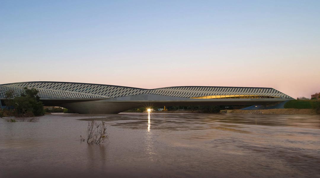 Set across the River Ebro, the Zaragoza Bridge Pavilion is a hybrid functioning as a pedestrian footbridge and the exhibition entrance. Expectedly, this highly detailed project amounted to a staggering 35 million euros–a copious amount of cash that had to address the difficulties brought on by the project’s shape and the site location of Ebro’s unstable river banks.
